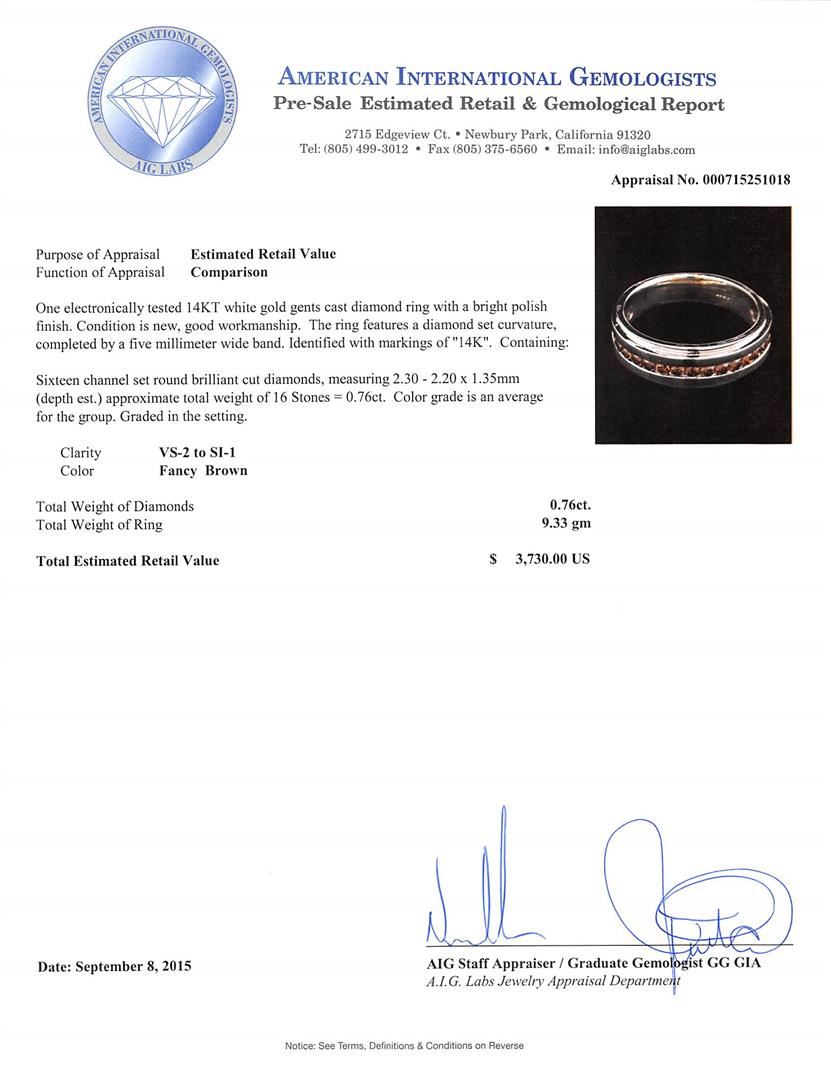 One electronically tested 14KT white gold gents cast diamond ring with a bright polish finish. The ring features a diamond set curvature, completed by a five millimeter wide band. Identified with markings of "14K". Condition is new, good workmanship. Containing: Sixteen channel set round brilliant cut diamonds, measuring 2.30 - 2.20 x 1.35mm (depth est.) approximate total weight of 16 Stones = 0.76ct. Color grade is an average for the group. Graded in the setting. Clarity: VS-2 to SI-1. Total Weight of Diamonds 0.76ct. Total Weight of Ring 9.33gm. AIG Appraised at $3,730.00.