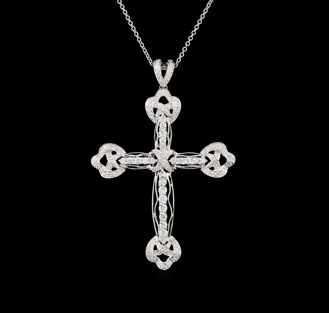 One electronically tested 18KT white gold cast & assembled diamond cross pendant with chain. Two and one-quarter inch length pendant features an elaborate diamond set cross, completed by a diamond set split bail. The pendant is supported by a sixteen inch length 14KT white gold cable chain, terminating in a lobster claw clasp. Bright polish finish. Identified with markings of "18K 750". Condition is new, good workmanship. Containing: Three prong set round brilliant cut diamonds, measuring 2.10 - 2.00 x 1.23mm (depth est.) approximate total weight of 3 Stones = 0.10ct. Graded in the setting. Clarity: SI-2. Color: G - H Twenty-One prong set round brilliant cut diamonds, measuring 1.80 - 1.60 x 1.02mm (depth est.) approximate total weight of 21 Stones = 0.38ct. Graded in the setting. Clarity: SI-2 to I-1. Color: G - H Ninety-Four prong set round brilliant cut diamonds, measuring 1.00 - 0.90 x 0.57mm (depth est.) approximate total weight of 94 Stones = 0.29ct. Graded in the setting. Clarity: I-1 to I-2. Color: G - I. Total Weight of Diamonds 0.77ct. Total Weight of Pendant With Chain 10.57gm. AIG Appraised at $4,875.00.