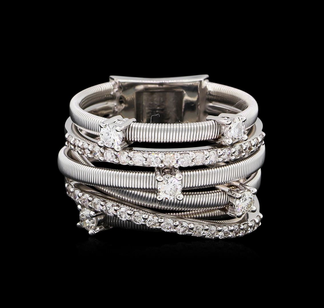 One electronically tested 14KT white gold lady's combination cast & assembled fashion ring with a bright polish and satin finish. The featured lady's ring has six partially overlapping rows and a shank measuring 11.23 millimeters wide. Identified with markings of "K14". Condition is new, good workmanship. Containing: Five prong set round brilliant cut diamonds, measuring 2.60 - 2.55 x 1.57mm (depth est.) approximate total weight of 5 Stones = 0.32ct. Graded in the setting. Clarity: SI-1 to SI-2. Color: H - I. Cut Good Thirty-Four prong set round brilliant cut diamonds, measuring 1.55 - 1.50 x 0.93mm (depth est.) approximate total weight of 34 Stones = 0.45ct. Graded in the setting. Clarity: SI-1 to I-1. Color: H - I. Cut Good. Total Weight of Diamonds 0.77ct. Total Weight of Ring 9.80gm. GAS Appraised at $3,790.00.