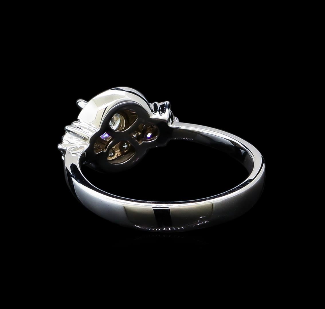 One electronically tested 14KT white gold lady's cast fashion wedding ring with a halo with a bright polish finish. The featured lady's ring has a pinched shank measuring 3.0 millimeters in width. Identified with markings of "14K". Condition is new, good workmanship. Containing: Twenty-Four prong set round brilliant cut diamonds, measuring 1.40 - 1.35 x 0.86mm (depth est.) approximate total weight of 24 Stones = 0.25ct. Graded in the setting. Clarity: SI-1 to SI-2. Color: H - I. Cut Good One prong set round brilliant cut diamond, measuring 5.04 - 5.00 x 3.40mm (depth est.) approximate weight of 0.52ct. Graded in the setting. Clarity: VS-2. Color: Very Good. Total Weight of Diamonds 0.77ct. Total Weight of Wedding Ring 3.40gm. GAS Appraised at $5,195.00.