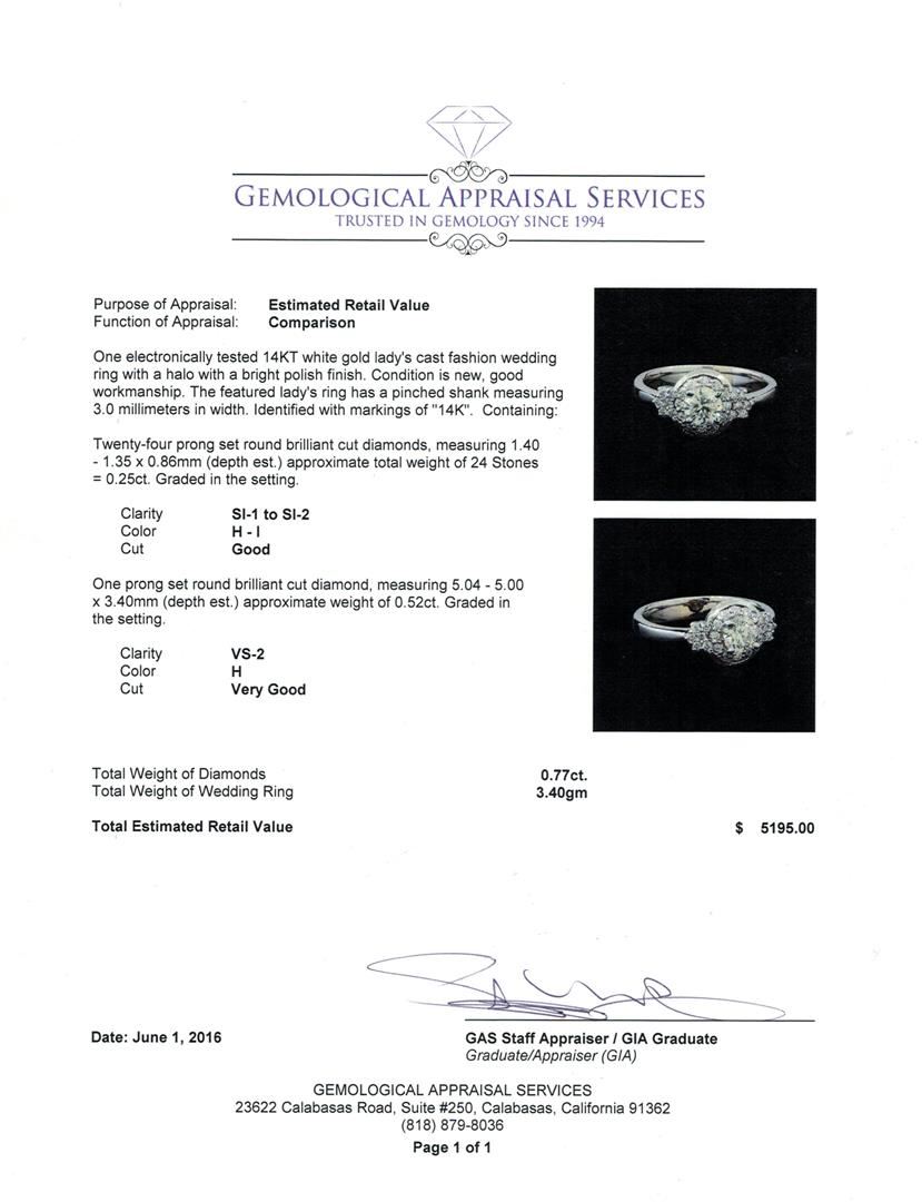One electronically tested 14KT white gold lady's cast fashion wedding ring with a halo with a bright polish finish. The featured lady's ring has a pinched shank measuring 3.0 millimeters in width. Identified with markings of "14K". Condition is new, good workmanship. Containing: Twenty-Four prong set round brilliant cut diamonds, measuring 1.40 - 1.35 x 0.86mm (depth est.) approximate total weight of 24 Stones = 0.25ct. Graded in the setting. Clarity: SI-1 to SI-2. Color: H - I. Cut Good One prong set round brilliant cut diamond, measuring 5.04 - 5.00 x 3.40mm (depth est.) approximate weight of 0.52ct. Graded in the setting. Clarity: VS-2. Color: Very Good. Total Weight of Diamonds 0.77ct. Total Weight of Wedding Ring 3.40gm. GAS Appraised.