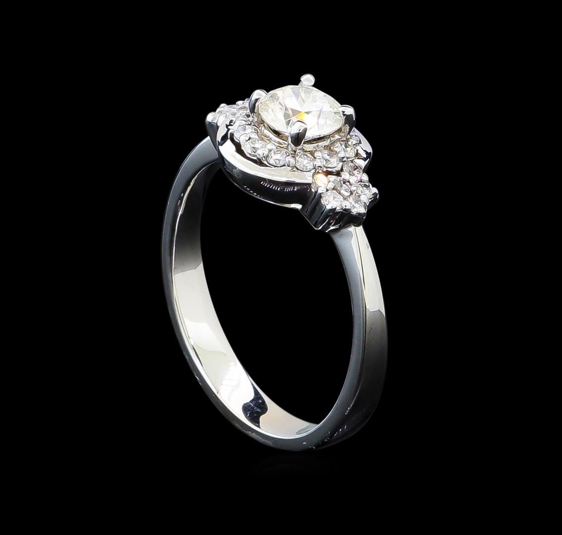 One electronically tested 14KT white gold lady's cast fashion wedding ring with a halo with a bright polish finish. The featured lady's ring has a pinched shank measuring 3.0 millimeters in width. Identified with markings of "14K". Condition is new, good workmanship. Containing: Twenty-Four prong set round brilliant cut diamonds, measuring 1.40 - 1.35 x 0.86mm (depth est.) approximate total weight of 24 Stones = 0.25ct. Graded in the setting. Clarity: SI-1 to SI-2. Color: H - I. Cut Good One prong set round brilliant cut diamond, measuring 5.04 - 5.00 x 3.40mm (depth est.) approximate weight of 0.52ct. Graded in the setting. Clarity: VS-2. Color: Very Good. Total Weight of Diamonds 0.77ct. Total Weight of Wedding Ring 3.40gm. GAS Appraised.