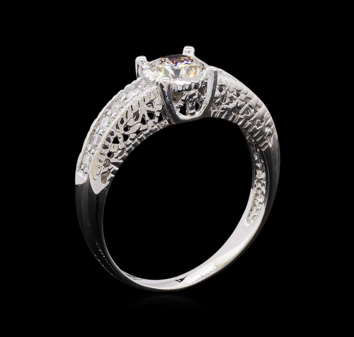 One electronically tested 18KT white gold lady's cast wedding ring with a bright polish finish. The featured lady's ring has a shank measuring 2.18 millimeters wide. Identified with markings of "750". Condition is new, good workmanship. Containing: One bezel set round brilliant cut diamond, measuring 5.00 - 4.95 x 3.06mm (depth est.) , 5.00.%. GTCF approximate weight of 0.52ct. Graded in the setting. Clarity: SI-2. Color: H - I. Cut Good Ten prong set round brilliant cut diamonds, measuring 1.90 - 1.80 x 1.15mm (depth est.) approximate total weight of 10 Stones = 0.25ct. Graded in the setting. Clarity: SI-2 to I-1. Color: G - Good. Total Weight of Diamonds 0.77ct. Total Weight of Ring 3.70gm GAS Appraised at $4,355.00.