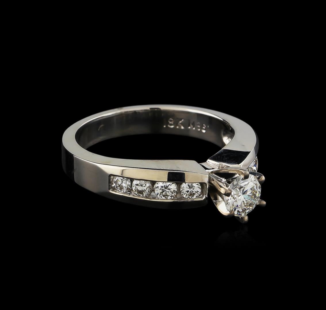 One electronically tested 18KT white gold lady's cast wedding ring with a bright polish finish. The featured lady's ring has a shank measuring 3.18 millimeters wide. Identified with markings of "18K". Condition is new, good workmanship. Containing: One prong set round brilliant cut diamond, measuring 4.77 - 4.75 x 3.00mm (depth est.) approximate weight of 0.42ct. Graded in the setting. Clarity: SI-2. Color: I. Cut Very Good Eight channel set round brilliant cut diamonds, measuring 2.30 - 2.20 x 1.40mm (depth est.) approximate total weight of 8 Stones = 0.35ct. Graded in the setting. Clarity: VS-2 to SI-1. Color: H - I. Cut Very Good. Total Weight of Diamonds 0.77ct. Total Weight of Ring 5.90gm. GAS Appraised at $4,545.00.