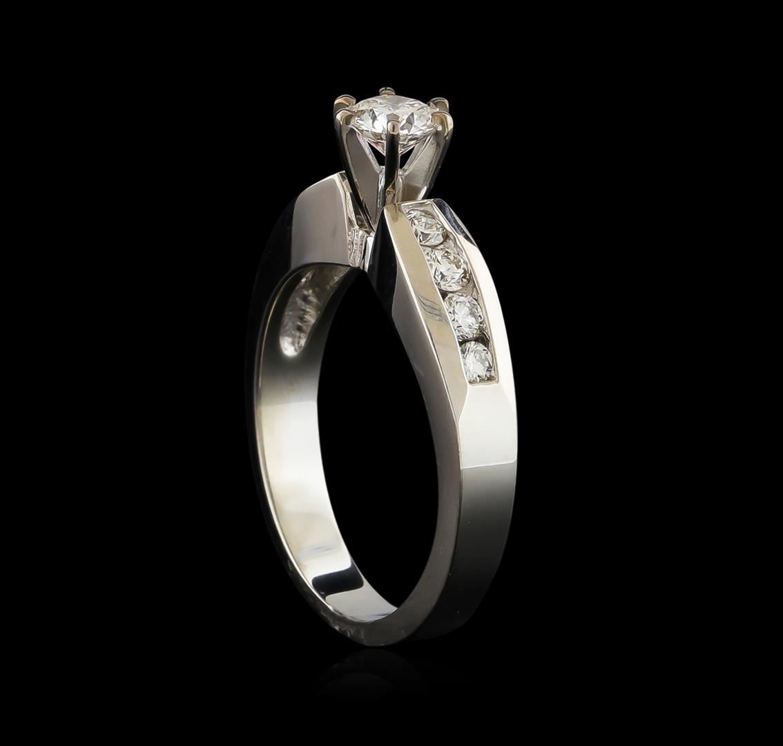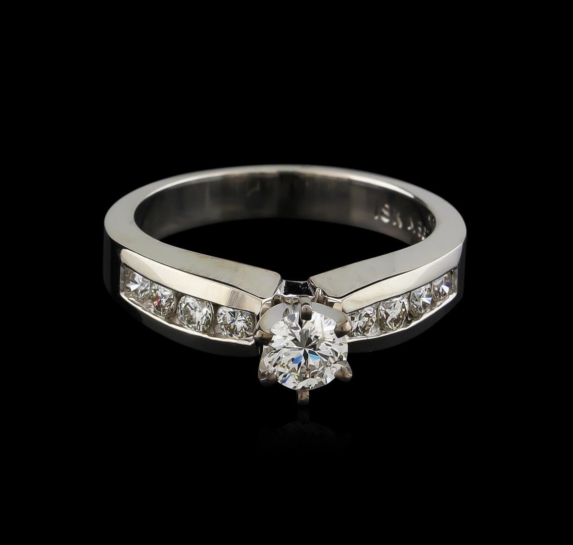 One electronically tested 18KT white gold lady's cast wedding ring with a bright polish finish. The featured lady's ring has a shank measuring 3.18 millimeters wide. Identified with markings of "18K". Condition is new, good workmanship. Containing: One prong set round brilliant cut diamond, measuring 4.77 - 4.75 x 3.00mm (depth est.) approximate weight of 0.42ct. Graded in the setting. Clarity: SI-2. Color: I. Cut Very Good Eight channel set round brilliant cut diamonds, measuring 2.30 - 2.20 x 1.40mm (depth est.) approximate total weight of 8 Stones = 0.35ct. Graded in the setting. Clarity: VS-2 to SI-1. Color: H - I. Cut Very Good. Total Weight of Diamonds 0.77ct. Total Weight of Ring 5.90gm. GAS Appraised at $4,545.00.