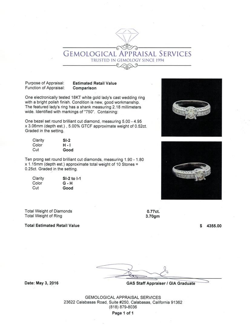 One electronically tested 18KT white gold lady's cast wedding ring with a bright polish finish. The featured lady's ring has a shank measuring 2.18 millimeters wide. Identified with markings of "750". Condition is new, good workmanship. Containing: One bezel set round brilliant cut diamond, measuring 5.00 - 4.95 x 3.06mm (depth est.) , 5.00.%. GTCF approximate weight of 0.52ct. Graded in the setting. Clarity: SI-2. Color: H - I. Cut Good Ten prong set round brilliant cut diamonds, measuring 1.90 - 1.80 x 1.15mm (depth est.) approximate total weight of 10 Stones = 0.25ct. Graded in the setting. Clarity: SI-2 to I-1. Color: G - Good. Total Weight of Diamonds 0.77ct. Total Weight of Ring 3.70gm GAS Appraised at $4,355.00.
