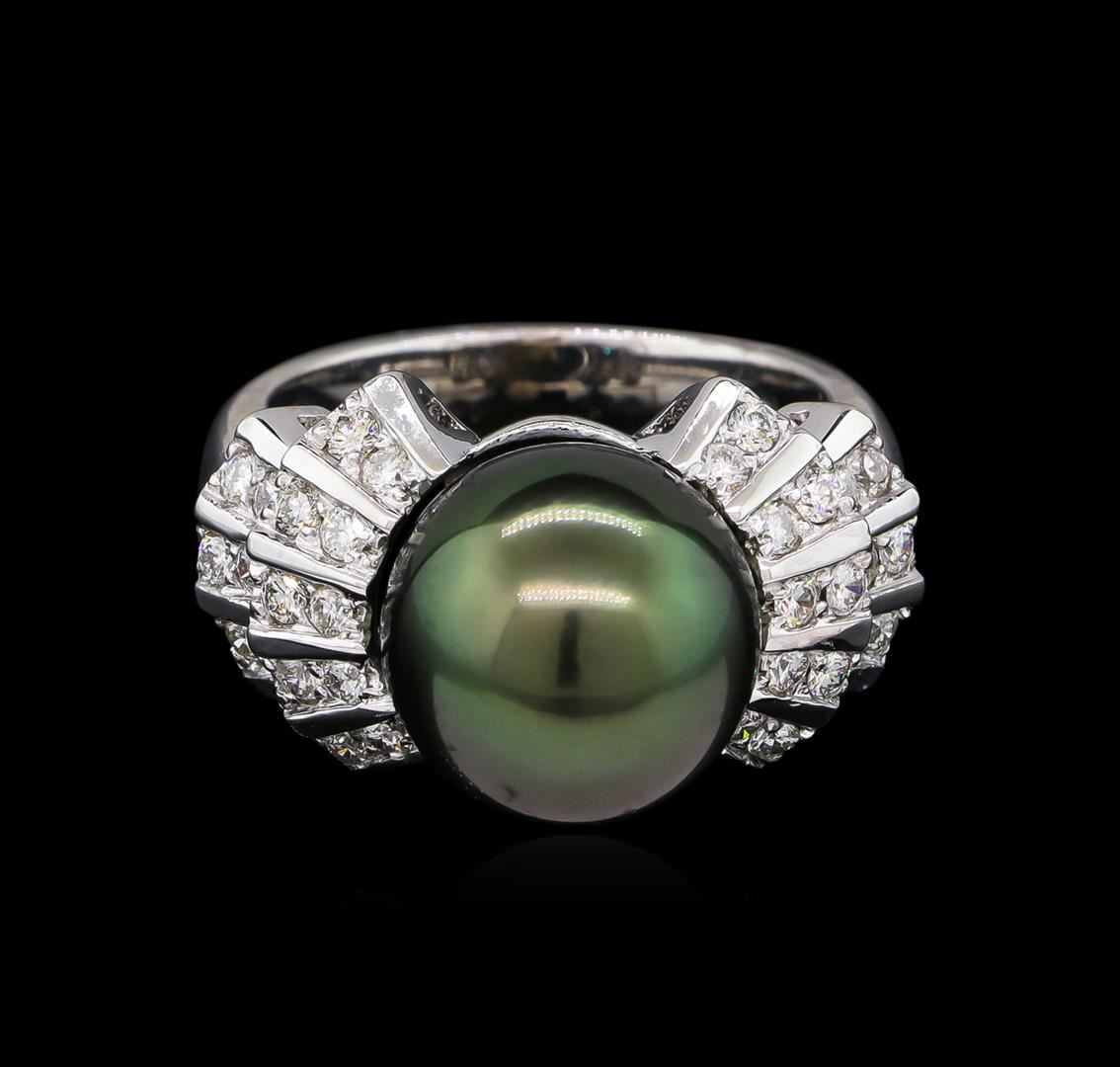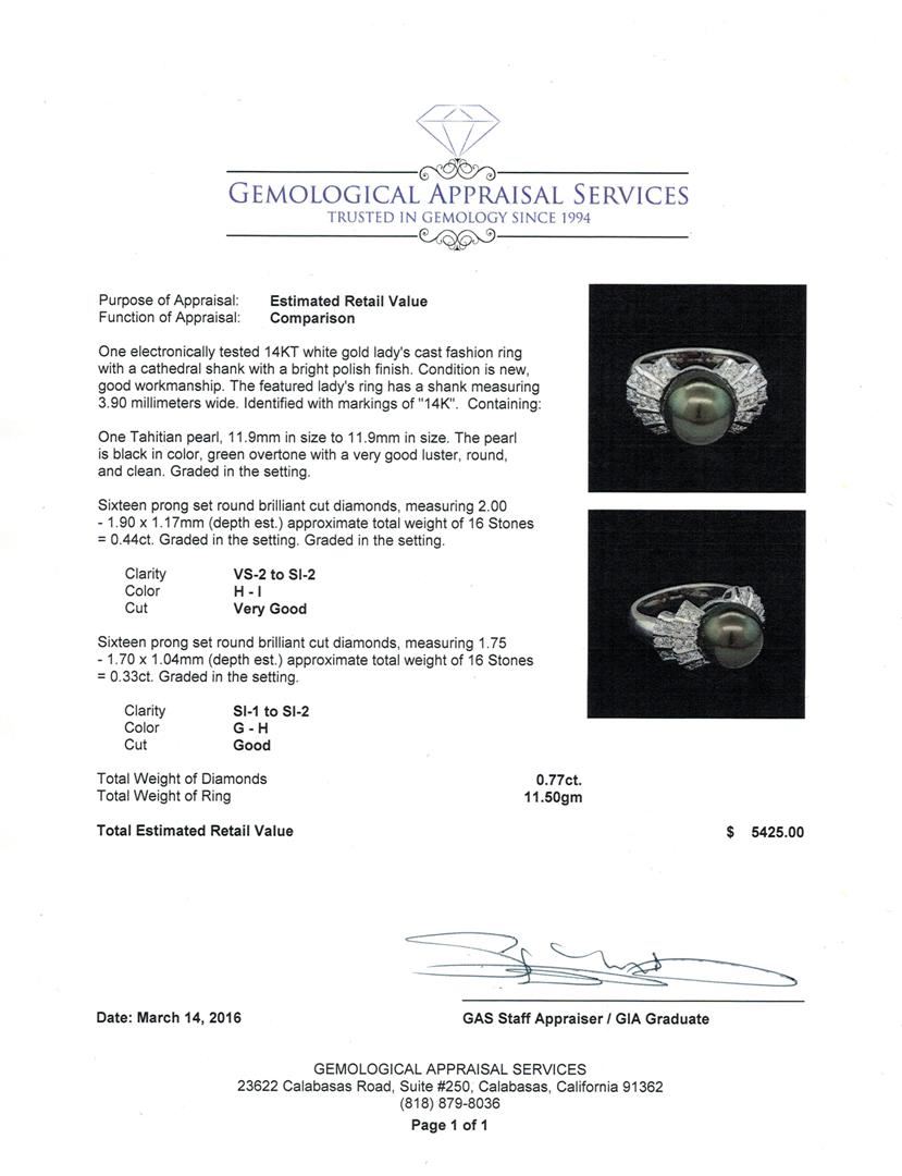 One electronically tested 14KT white gold lady's cast fashion ring with a cathedral shank with a bright polish finish. The featured lady's ring has a shank measuring 3.90 millimeters wide. Identified with markings of "14K". Condition is new, good workmanship. Containing: One Tahitian pearl, 11.9mm in size to 11.9mm in size. The pearl is black in color, green overtone with a very good luster, round, and clean. Graded in the setting. Sixteen prong set round brilliant cut diamonds, measuring 2.00 - 1.90 x 1.17mm (depth est.) approximate total weight of 16 Stones = 0.44ct. Graded in the setting. Graded in the setting. Clarity: VS-2 to SI-2. Color: H - I. Cut Very Good Sixteen prong set round brilliant cut diamonds, measuring 1.75 - 1.70 x 1.04mm (depth est.) approximate total weight of 16 Stones = 0.33ct. Graded in the setting. Clarity: SI-1 to SI-2. Color: G - Good. Total Weight of Diamonds 0.77ct. Total Weight of Ring 11.50gm. GAS Appraised at $5,425.00.