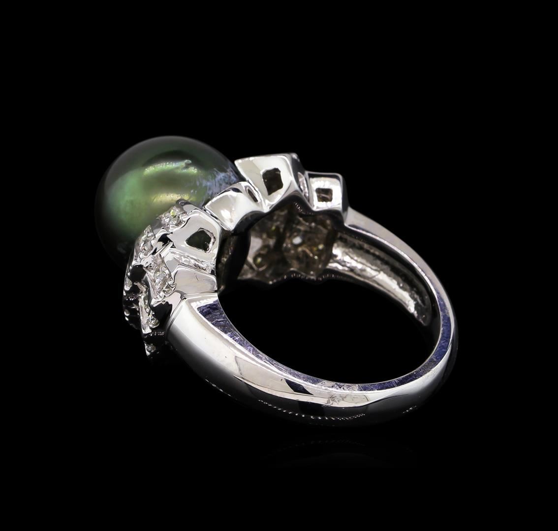 One electronically tested 14KT white gold lady's cast fashion ring with a cathedral shank with a bright polish finish. The featured lady's ring has a shank measuring 3.90 millimeters wide. Identified with markings of "14K". Condition is new, good workmanship. Containing: One Tahitian pearl, 11.9mm in size to 11.9mm in size. The pearl is black in color, green overtone with a very good luster, round, and clean. Graded in the setting. Sixteen prong set round brilliant cut diamonds, measuring 2.00 - 1.90 x 1.17mm (depth est.) approximate total weight of 16 Stones = 0.44ct. Graded in the setting. Graded in the setting. Clarity: VS-2 to SI-2. Color: H - I. Cut Very Good Sixteen prong set round brilliant cut diamonds, measuring 1.75 - 1.70 x 1.04mm (depth est.) approximate total weight of 16 Stones = 0.33ct. Graded in the setting. Clarity: SI-1 to SI-2. Color: G - Good. Total Weight of Diamonds 0.77ct. Total Weight of Ring 11.50gm. GAS Appraised at $5,425.00.