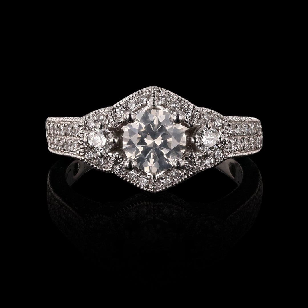 One electronically tested platinum ladies cast diamond unity ring. Condition is new, good workmanship. The featured diamond is accented by a single diamond on either side and set within a stylized diamond bezel supported by a diamond set under gallery and diamond set shoulders, completed by a two millimeter wide band. Bright polish finish with milgrain detailing throughout. Trademark is Orianne. Identified with markings of "PT950". Containing: One prong set round brilliant cut diamond, measuring 5.91 - 5.89 x 3.61mm exact weight 0.77ct with a faint fluorescence. EGL Hearts & Arrows Diamond Report attached. Graded loose prior to setting in the EGL Laboratory Report #US 917731005D. Clarity SI-2 Color H Depth 61.2% Table 59.0% Pavil. Depth% 43.9% Polish Excellent Symmetry Very Good One hundred thirty-four prong set round brilliant cut diamonds approximate total weight of 134 Stones = 0.85ctw. Graded in the setting. Clarity VS-1 to VS-2 Color D - F Total Weight of Diamonds 1.62ctw. Total Weight of Ring 6.26 gm
