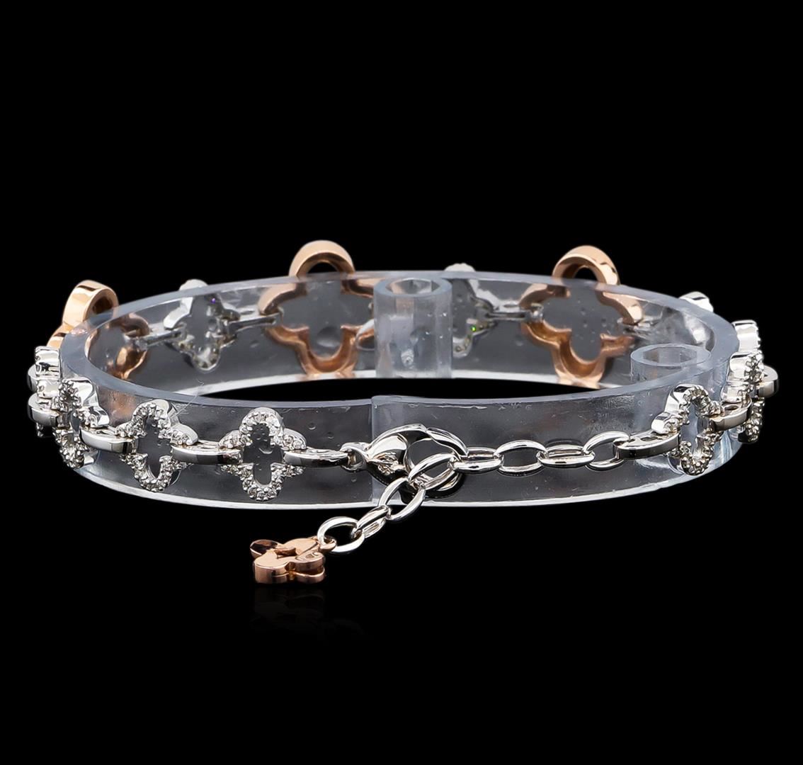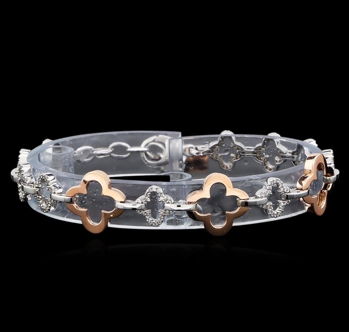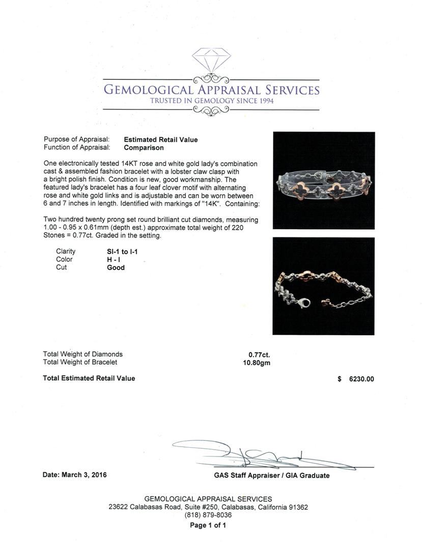 One electronically tested 14KT rose and white gold lady's combination cast & assembled fashion bracelet with a lobster claw clasp with a bright polish finish. The featured lady's bracelet has a four leaf clover motif with alternating rose and white gold links and is adjustable and can be worn between 6 and 7 inches in length. Identified with markings of "14K". Condition is new, good workmanship. Containing: Two Hundred Twenty prong set round brilliant cut diamonds, measuring 1.00 - 0.95 x 0.61mm (depth est.) approximate total weight of 220 Stones = 0.77ct. Graded in the setting. Clarity: SI-1 to I-1. Color: H - I. Cut Good. Total Weight of Diamonds 0.77ct. Total Weight of Bracelet 10.80gm. GAS Appraised at $6,230.00.