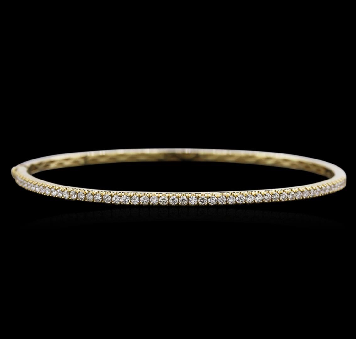 One electronically tested 14KT yellow gold ladies cast & assembled diamond bangle bracelet with a bright polish finish. Six and one-half inch wearable length diamond bangle bracelet features a diamond set curvature supported by hinged shoulders, terminating in a concealed clasp. Condition is good. Containing: Forty-Nine prong set round brilliant cut diamonds, measuring 1.60 - 1.50 x 0.93mm (depth est.) approximate total weight of 49 Stones = 0.78ct. Graded in the setting. Clarity: SI-2 to I-1. Color: G - I. Total Weight of Diamonds 0.78ct. Total Weight of Bangle Bracelet 6.19gm. AIG Appraised at $3,195.00.