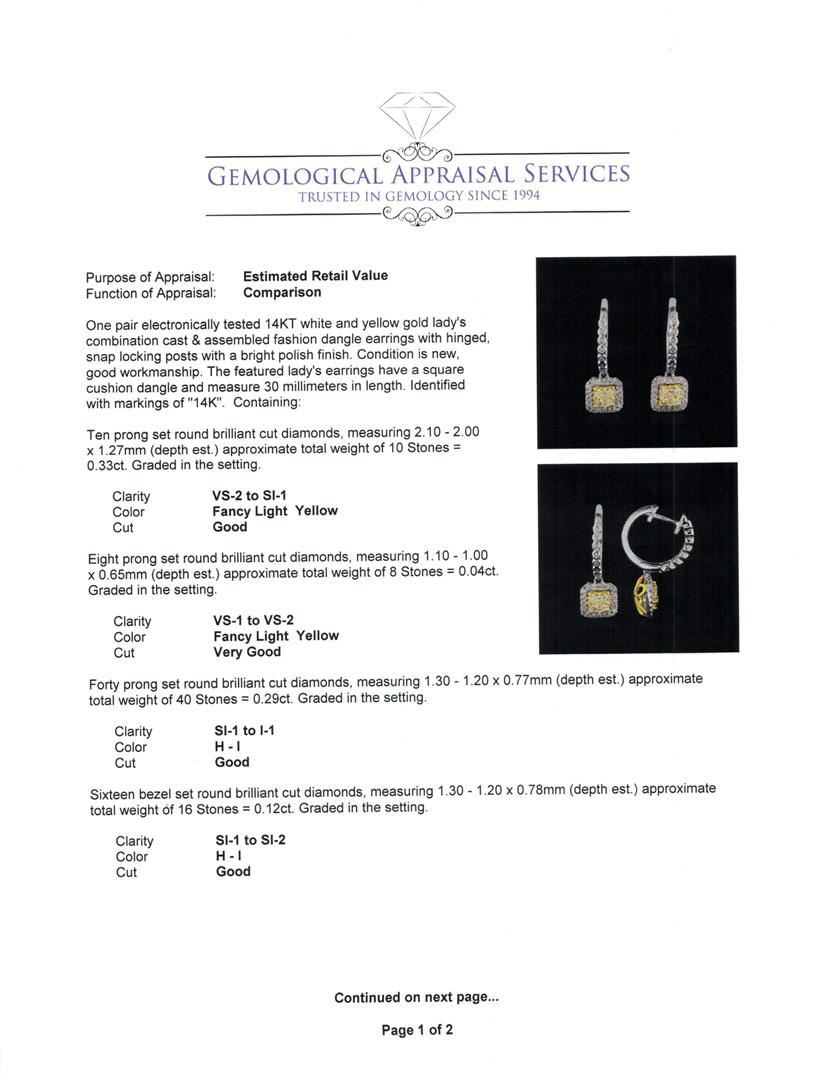 One pair electronically tested 14KT white and yellow gold lady's combination cast & assembled fashion dangle earrings with hinged, snap locking posts with a bright polish finish. The featured lady's earrings have a square cushion dangle and measure 30 millimeters in length. Identified with markings of '14K'. Condition is new, good workmanship. Containing: Ten prong set round brilliant cut diamonds, measuring 2.10 - 2.00 x 1.27mm (depth est.) approximate total weight of 10 Stones = 0.33ct. Graded in the setting. Clarity VS-2 to SI-1 Cut Good Eight prong set round brilliant cut diamonds, measuring 1.10 - 1.00 x 0.65mm (depth est.) approximate total weight of 8 Stones = 0.04ct. Graded in the setting. Clarity VS-1 to VS-2 Cut Very Good Forty prong set round brilliant cut diamonds, measuring 1.30 - 1.20 x 0.77mm (depth est.) approximate total weight of 40 Stones = 0.29ct. Graded in the setting. Clarity SI-1 to I-1. Color: H - I Cut Good Sixteen bezel set round brilliant cut diamonds, measuring 1.30 - 1.20 x 0.78mm (depth est.) approximate total weight of 16 Stones = 0.12ct. Graded in the setting. Clarity SI-1 to SI-2. Color: H - I Cut Good. Total Weight of Diamonds 0.78ct.. Total Weight of Earrings 4.70gm. GAS Appraised at $3,370.00.