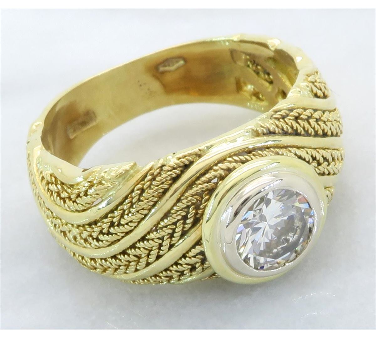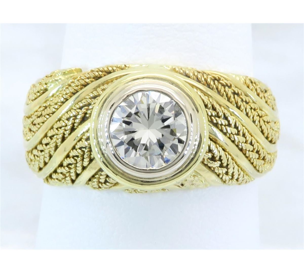One tested 18K yellow gold diamond ring. Containing: One Round Brilliant Cut Diamond. Approximate Size: .78CT, Clarity: SI1, Color: I-J. All diamonds are graded in the mounting unless otherwise stated. Weight of ring: 6.3 grams, Size: 6.0.
