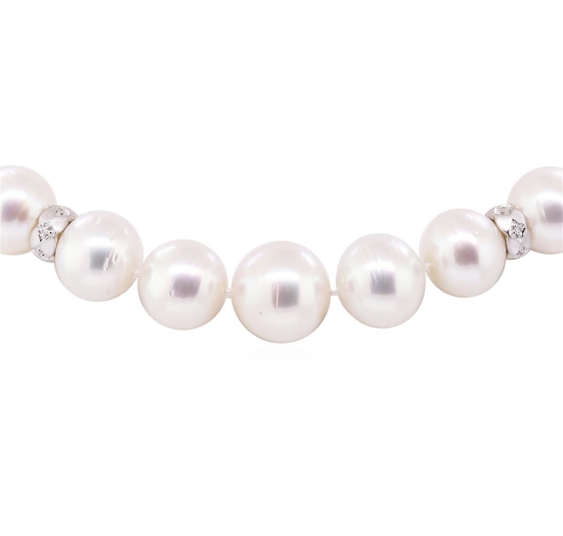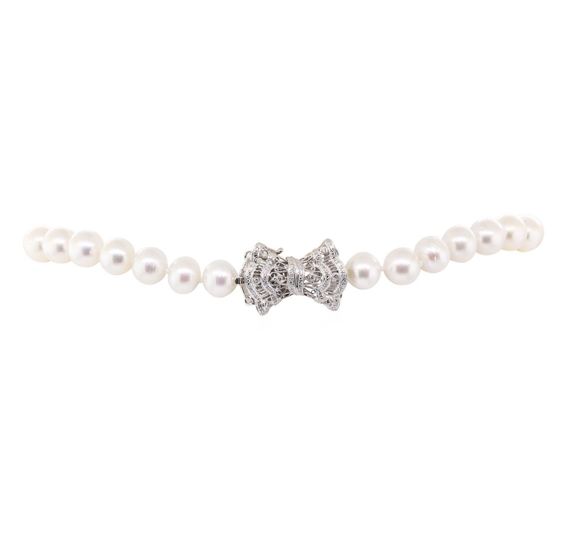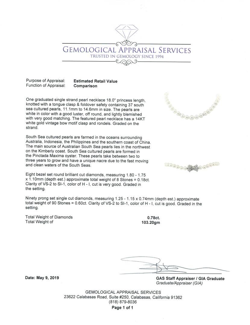One graduated single strand pearl necklace 18.0' princess length, knotted with a tongue clasp & foldover safety containing 37 south sea cultured pearls, 11.1mm to 14.6mm in size. The pearls are white in color with a good luster, off round, and lightly blemished with very good matching. The featured pearl necklace has a 14KT white gold vintage bow motif clasp and rondels. Graded on the strand.South Sea cultured pearls are farmed in the oceans surrounding Australia, Indonesia, the Philippines and the southern coast of China. The main source of Australian South Sea pearls lies in the northwest on the Kimberly coast. South Sea cultured pearls are formed in the Pinctada Maxima oyster. These pearls take between two to three years to grow and have a unique nacre due to the fast moving and clean waters of the South Seas. Eight bezel set round brilliant cut diamonds, measuring 1.80 - 1.75 x 1.10mm (depth est.) approximate total weight of 8 Stones = 0.18ct. Graded in the setting. Color H - I Clarity VS-2 to SI-1 Cut Very Good Ninety prong set single cut diamonds, measuring 1.25 - 1.15 x 0.74mm (depth est.) approximate total weight of 90 Stones = 0.60 ct. Graded in the setting. Color H - I Clarity VS-2 to SI-1 Cut Good. Total Weight of Diamonds 0.78ct.. Total Weight of 103.20gm GAS Appraised at $21000.00. GAS Appraised.