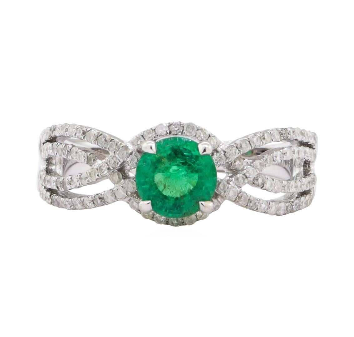 One electronically tested 14KT white gold ladies cast & assembled emerald & diamond ring. The ring features an emerald set within a diamond bezel, supported by four diamond ribbons at the shoulders, completed by a two millimeter wide band. Bright polish finish. Trademark is Orianne. Identified with markings of "14K". Condition is new, good workmanship. Containing: One prong set round mixed cut natural emerald, measuring 6.00 - 6.00 x 3.70 mm, exact weight 0.78ct., clarity is moderately included, type III, medium, very slightly grayish, green color, (GIA G 5/3), cut is good. Transmitting light somewhat diffusely, transparent to translucent. Naturally occurring internal & external characteristics are present. Indications of oil residue. Graded in the setting. One Hundred Four prong set round brilliant cut diamonds exact total weight 104 Stones = 0.44ct. The color grade reflects the overall average for the group. Graded in the setting. Clarity I-1 to I-3 Color F - H Total Weight of Colored Stones0.78 ct. Total Weight of Diamonds 0.44 ct. Total Weight of Ring 4.00 gm Estimated Retail Value $ 4,650.00 US