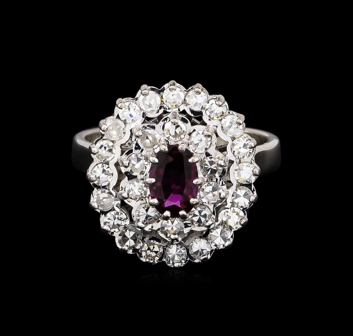 One electronically tested 10KT white gold lady's cast fashion ring with a double basket halo with a bright polish finish. The featured lady's ring has a shank measuring 2.85 millimeters wide. Identified with markings of "10K". Condition is like new, good workmanship. Containing: Thirty prong set single cut diamonds, measuring 2.10 - 2.00 x 1.27mm (depth est.) approximate total weight of 30 Stones = 1.00ct. Graded in the setting. Clarity: VS-2 to SI-1. Color: H - JCut Good One prong set oval modified brilliant cut natural purple sapphire, measuring 7.10 x 5.11 x 2.24mm, 12%. bulge factor,approximate weight of 0.78ct., clarity is slightly included, type II, medium dark, moderately strong, reddish purple color, (GIA rP 6/4), cut is good. Transmitting light with a minimum of distortion, transparent. Colored gemstones are presumed to have been subjected to commonly used enhancement processes. Graded in the setting.Total Weight of Colored Stones 0.78ct. Total Weight of Diamonds 1.00ct. Total Weight of Ring 5.90gm. GAS Appraised at $3,935.00.