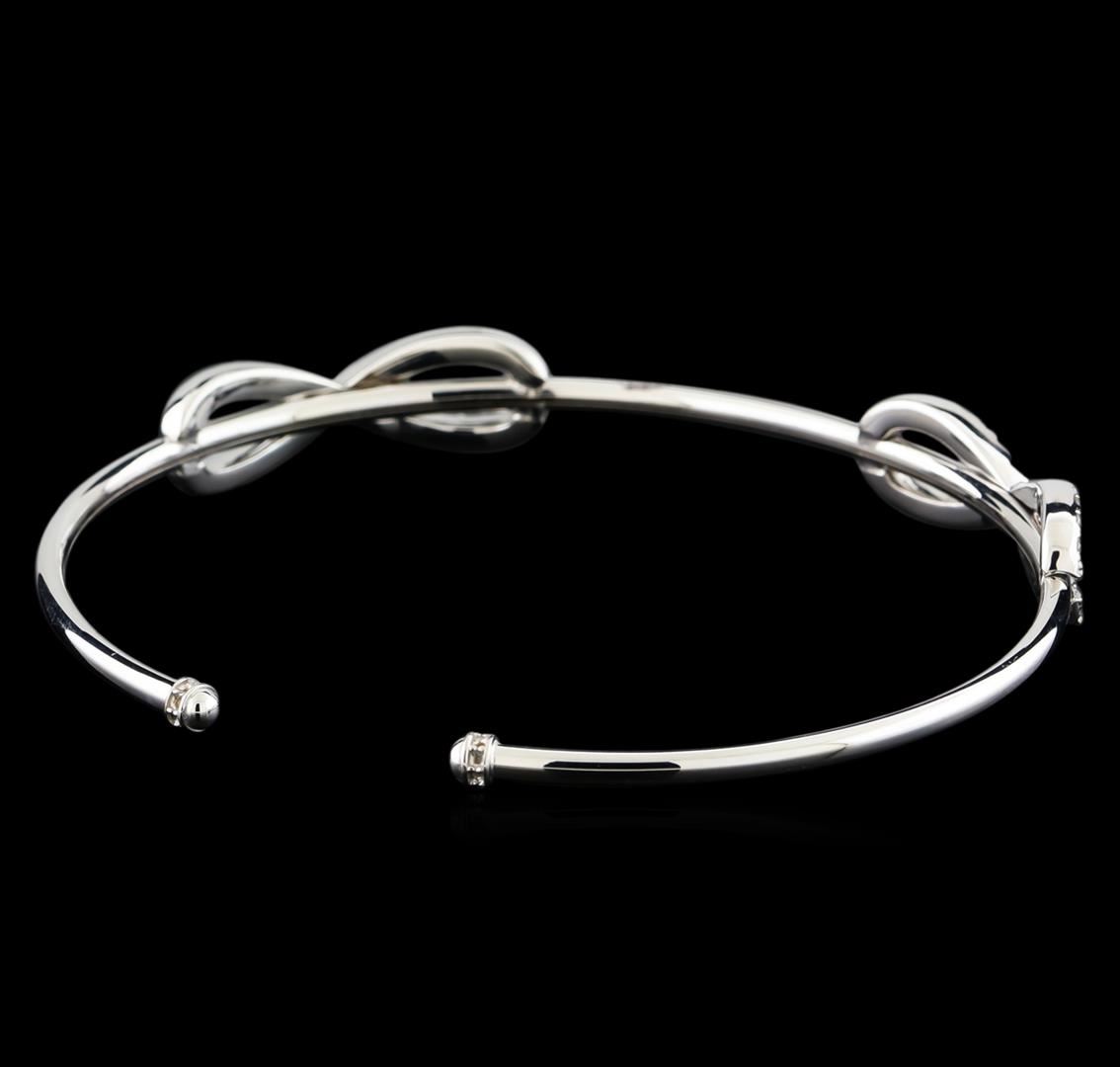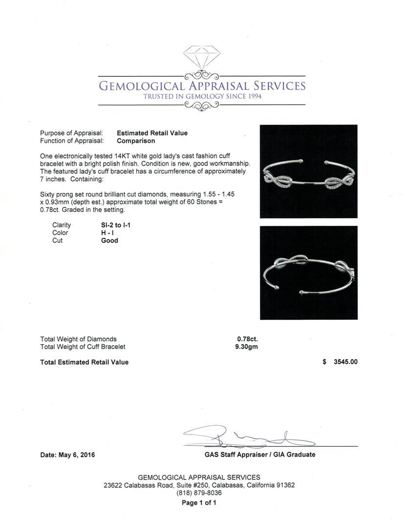 One electronically tested 14KT white gold lady's cast fashion cuff bracelet with a bright polish finish. The featured lady's cuff bracelet has a circumference of approximately 7 inches. Condition is new, good workmanship. Containing: Sixty prong set round brilliant cut diamonds, measuring 1.55 - 1.45 x 0.93mm (depth est.) approximate total weight of 60 Stones = 0.78ct. Graded in the setting. Clarity: SI-2 to I-1. Color: H - I. Cut Good. Total Weight of Diamonds 0.78ct. Total Weight of Cuff Bracelet 9.30gm GAS Appraised at $3,545.00.