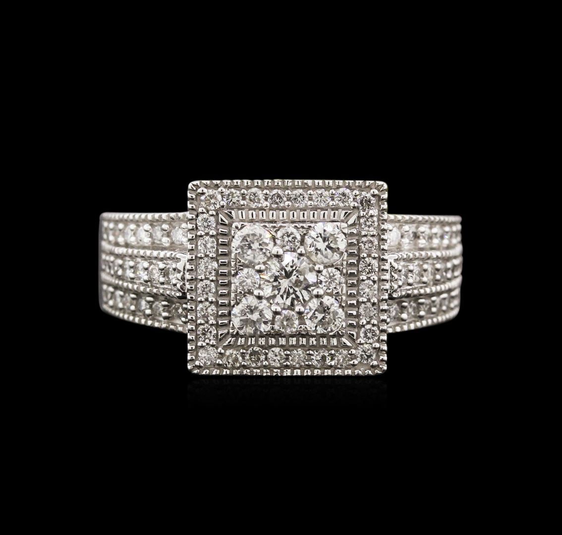 One electronically tested 14KT white gold lady's cast fashion ring with a bright polish finish. Condition is new. Identified with markings of "14K". Containing: One prong set round brilliant cut diamond, measuring 3.50 - 3.45 x 2.09mm (depth est.) approximate weight of 0.16ct. Graded in the setting. Clarity: SI-2. Color: I. Cut: Good. Four prong set round brilliant cut diamonds, measuring 2.40 - 2.30 x 1.41mm (depth est.) approximate total weight of 4 Stones = 0.20ct. Graded in the setting. Clarity: SI-2 to I-1. Color: H - I. Cut: Good. Seventy prong set round brilliant cut diamonds, measuring 1.20 - 1.10 x 0.70mm (depth est.) approximate total weight of 70 Stones = 0.42ct. Graded in the setting. Clarity: SI-1 to I-1. Color: H - I. Cut: Good. Total Weight of Diamonds: 0.78ct. Total Weight of Ring: 6.40 gm. GAS Appraised at $5,010.00.