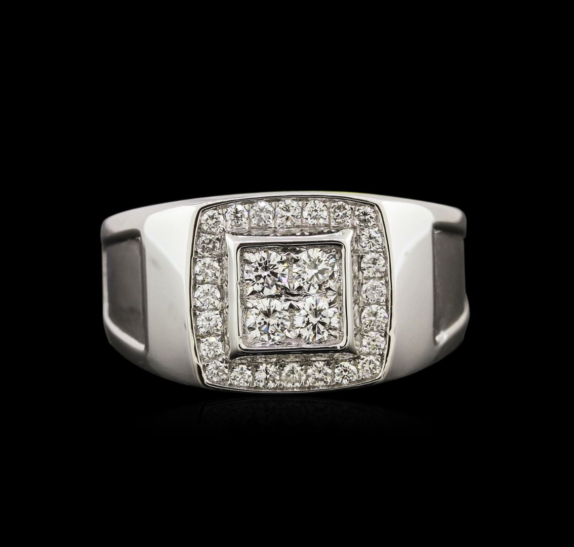 One electronically tested 14KT white gold man's cast fashion ring with a tapered shank with a bright polish finish. Condition is new. Identified with markings of "14K". Containing: Four bead set round brilliant cut diamonds, measuring 3.10 - 3.05 x 1.85mm (depth est.) approximate total weight of 4 Stones = 0.40ct. Graded in the setting. Clarity: VS-2 to SI-1. Color: H - I. Cut: Good. Twenty-four bead set round brilliant cut diamonds, measuring 1.70 - 1.60 x 0.99mm (depth est.) approximate total weight of 24 Stones = 0.38ct. Graded in the setting. Clarity: VS-2 to SI-2. Color: H - I. Cut: Good. Total Weight of Diamonds: 0.78ct. Total Weight of Ring: 8.90 gm. GAS Appraised at $5,150.00.