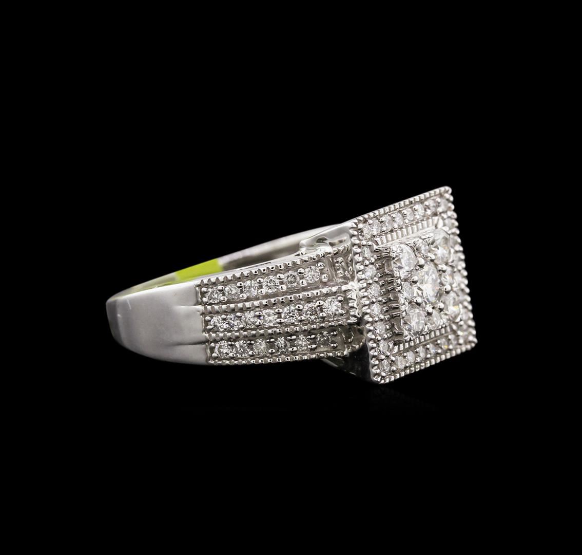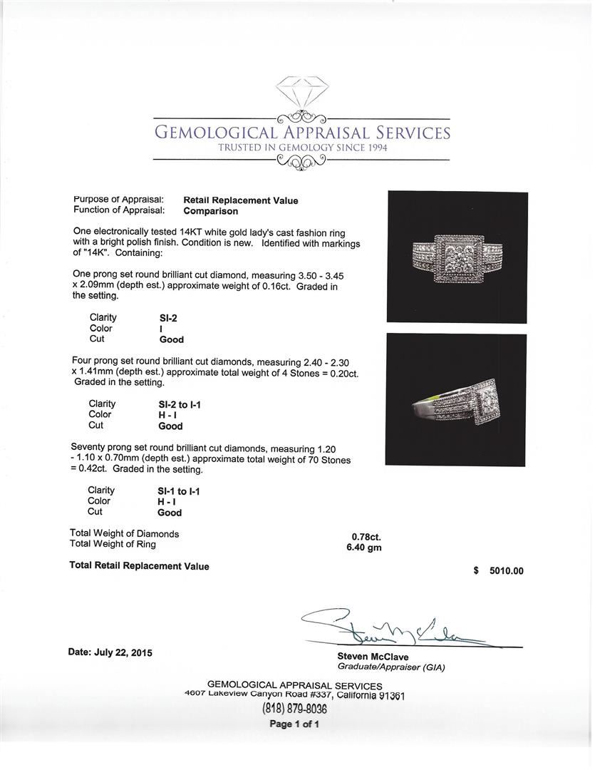 One electronically tested 14KT white gold lady's cast fashion ring with a bright polish finish. Condition is new. Identified with markings of "14K". Containing: One prong set round brilliant cut diamond, measuring 3.50 - 3.45 x 2.09mm (depth est.) approximate weight of 0.16ct. Graded in the setting. Clarity: SI-2. Color: I. Cut: Good. Four prong set round brilliant cut diamonds, measuring 2.40 - 2.30 x 1.41mm (depth est.) approximate total weight of 4 Stones = 0.20ct. Graded in the setting. Clarity: SI-2 to I-1. Color: H - I. Cut: Good. Seventy prong set round brilliant cut diamonds, measuring 1.20 - 1.10 x 0.70mm (depth est.) approximate total weight of 70 Stones = 0.42ct. Graded in the setting. Clarity: SI-1 to I-1. Color: H - I. Cut: Good. Total Weight of Diamonds: 0.78ct. Total Weight of Ring: 6.40 gm. GAS Appraised at $5,010.00.