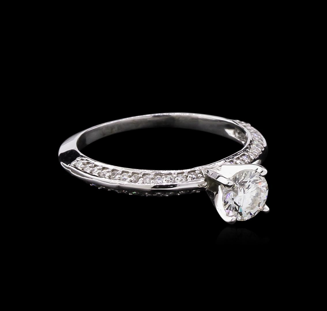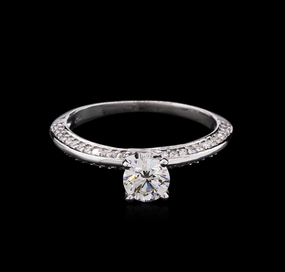 1.64 grams total weight; Size 5.5; Main stone= 0.48, SI2 clarity, H color; 48 smaller stones with a total weight of 0.30ct. SI1 clarity, G color.