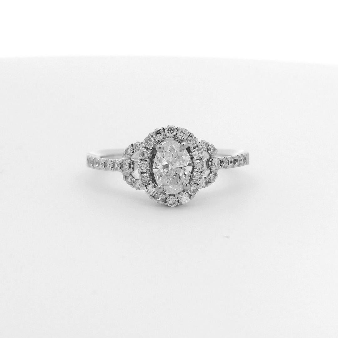 A perfect blend of elegance and charm, this 0.79 ctw diamond halo ring in 14KT white gold highlights a 0.46ct oval diamond in the center with I-1 clarity. Framed by 36 round brilliant diamonds totaling 0.33ct, the ring exudes a sophisticated allure, with each diamond meticulously set to enhance its brilliance. This piece is a refined choice for those who appreciate understated luxury.