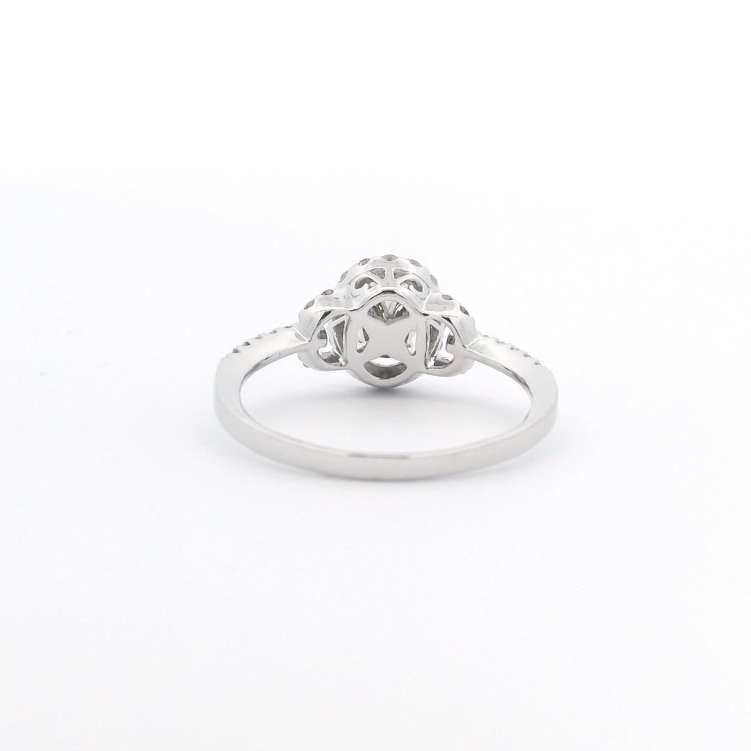 A perfect blend of elegance and charm, this 0.79 ctw diamond halo ring in 14KT white gold highlights a 0.46ct oval diamond in the center with I-1 clarity. Framed by 36 round brilliant diamonds totaling 0.33ct, the ring exudes a sophisticated allure, with each diamond meticulously set to enhance its brilliance. This piece is a refined choice for those who appreciate understated luxury.