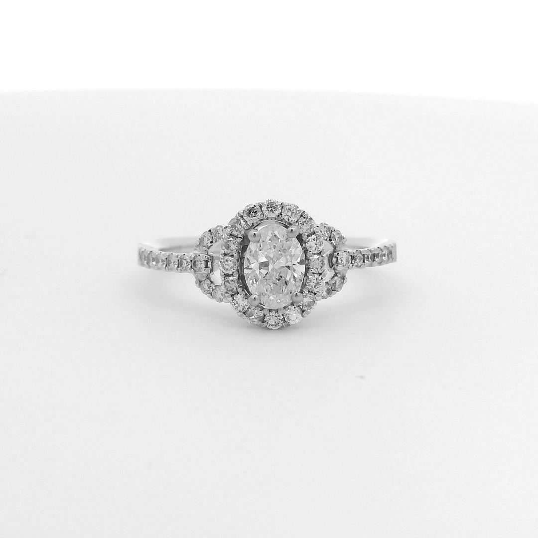 A perfect blend of elegance and charm, this 0.79 ctw diamond halo ring in 14KT white gold highlights a 0.46ct oval diamond in the center with I-1 clarity. Framed by 36 round brilliant diamonds totaling 0.33ct, the ring exudes a sophisticated allure, with each diamond meticulously set to enhance its brilliance. This piece is a refined choice for those who appreciate understated luxury.