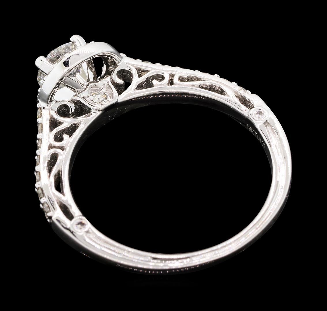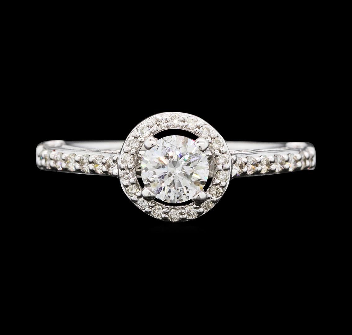One electronically tested 14KT white gold lady's cast wedding ring with a cathedral shank with a halo with a bright polish finish. The featured lady's ring has a shank measuring 1.25 millimeters wide. Identified with markings of '14K'. Condition is new, good workmanship. Containing: One prong set round brilliant cut diamond, measuring 5.10 - 5.08 x 3.26mm (depth est.) approximate weight of 0.52ct. Graded in the setting. Color H - I Clarity I-1 Cut Very Good Sixteen prong set round brilliant cut diamonds, measuring 1.40 - 1.30 x 0.84mm (depth est.) approximate total weight of 16 Stones = 0.16ct. Graded in the setting. Color H - I Clarity SI-1 to SI-2 Cut Very Good Twenty-Two prong set round brilliant cut diamonds, measuring 1.20 - 1.00 x 0.68mm (depth est.) approximate total weight of 22 Stones = 0.11ct. Graded in the setting. Color H - I Clarity SI-1 to SI-2 Cut Very Good. Total Weight of Diamonds 0.79ct.. Total Weight of Ring 3.30gm GAS Appraised at $4,255.00.