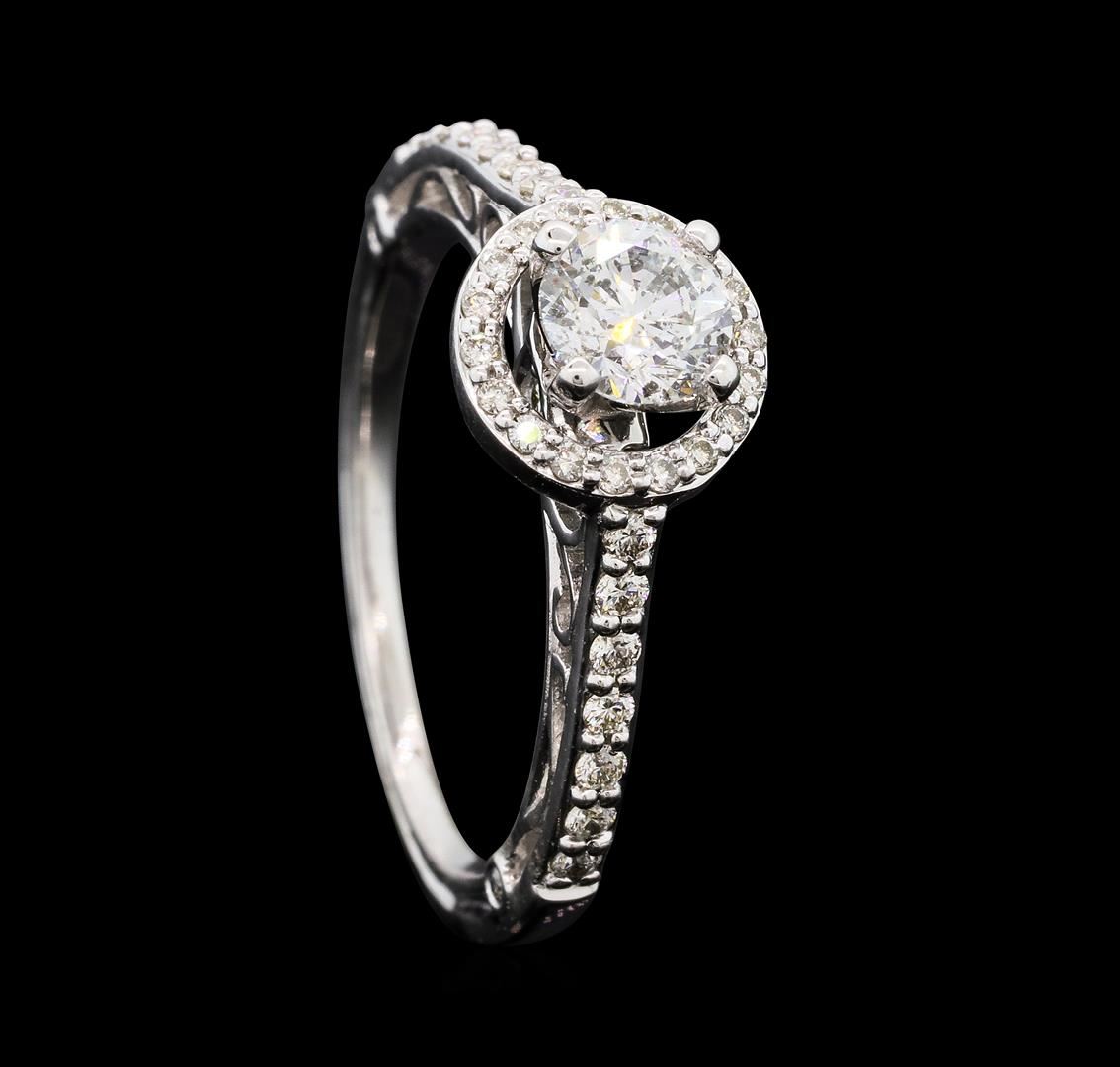 One electronically tested 14KT white gold lady's cast wedding ring with a cathedral shank with a halo with a bright polish finish. The featured lady's ring has a shank measuring 1.25 millimeters wide. Identified with markings of '14K'. Condition is new, good workmanship. Containing: One prong set round brilliant cut diamond, measuring 5.10 - 5.08 x 3.26mm (depth est.) approximate weight of 0.52ct. Graded in the setting. Color H - I Clarity I-1 Cut Very Good Sixteen prong set round brilliant cut diamonds, measuring 1.40 - 1.30 x 0.84mm (depth est.) approximate total weight of 16 Stones = 0.16ct. Graded in the setting. Color H - I Clarity SI-1 to SI-2 Cut Very Good Twenty-Two prong set round brilliant cut diamonds, measuring 1.20 - 1.00 x 0.68mm (depth est.) approximate total weight of 22 Stones = 0.11ct. Graded in the setting. Color H - I Clarity SI-1 to SI-2 Cut Very Good. Total Weight of Diamonds 0.79ct.. Total Weight of Ring 3.30gm GAS Appraised at $4,255.00.