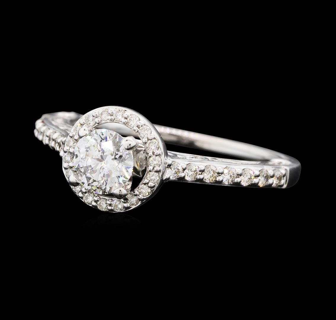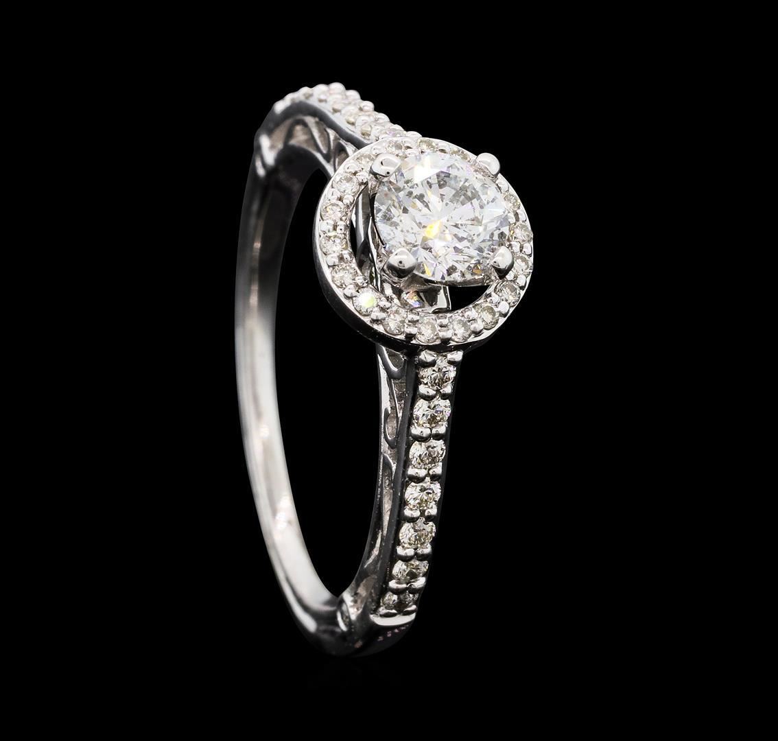 One electronically tested 14KT white gold lady's cast wedding ring with a cathedral shank with a halo with a bright polish finish. The featured lady's ring has a shank measuring 1.25 millimeters wide. Identified with markings of '14K'. Condition is new, good workmanship. Containing: One prong set round brilliant cut diamond, measuring 5.10 - 5.08 x 3.26mm (depth est.) approximate weight of 0.52ct. Graded in the setting. Color H - I Clarity I-1 Cut Very Good Sixteen prong set round brilliant cut diamonds, measuring 1.40 - 1.30 x 0.84mm (depth est.) approximate total weight of 16 Stones = 0.16ct. Graded in the setting. Color H - I Clarity SI-1 to SI-2 Cut Very Good Twenty-Two prong set round brilliant cut diamonds, measuring 1.20 - 1.00 x 0.68mm (depth est.) approximate total weight of 22 Stones = 0.11ct. Graded in the setting. Color H - I Clarity SI-1 to SI-2 Cut Very Good. Total Weight of Diamonds 0.79ct.. Total Weight of Ring 3.30gm GAS Appraised.