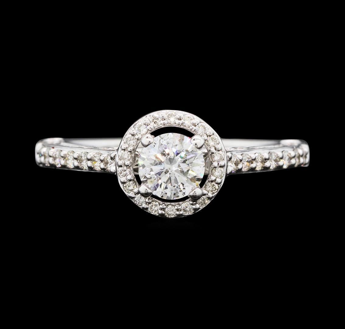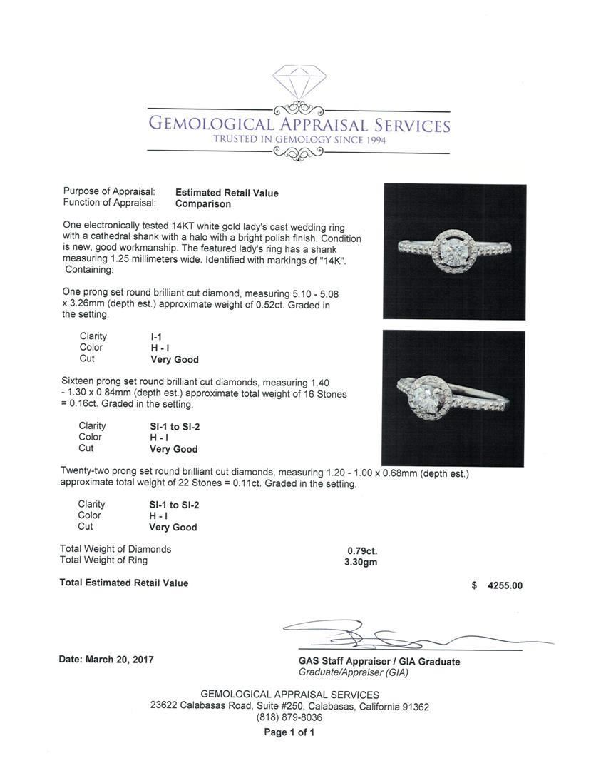 One electronically tested 14KT white gold lady's cast wedding ring with a cathedral shank with a halo with a bright polish finish. The featured lady's ring has a shank measuring 1.25 millimeters wide. Identified with markings of '14K'. Condition is new, good workmanship. Containing: One prong set round brilliant cut diamond, measuring 5.10 - 5.08 x 3.26mm (depth est.) approximate weight of 0.52ct. Graded in the setting. Color H - I Clarity I-1 Cut Very Good Sixteen prong set round brilliant cut diamonds, measuring 1.40 - 1.30 x 0.84mm (depth est.) approximate total weight of 16 Stones = 0.16ct. Graded in the setting. Color H - I Clarity SI-1 to SI-2 Cut Very Good Twenty-Two prong set round brilliant cut diamonds, measuring 1.20 - 1.00 x 0.68mm (depth est.) approximate total weight of 22 Stones = 0.11ct. Graded in the setting. Color H - I Clarity SI-1 to SI-2 Cut Very Good. Total Weight of Diamonds 0.79ct.. Total Weight of Ring 3.30gm GAS Appraised.