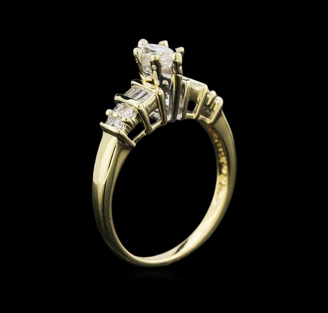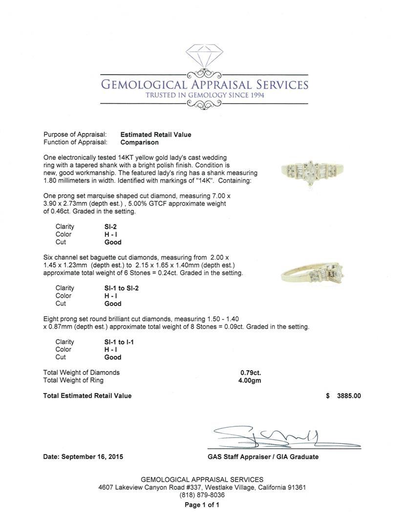 One electronically tested 14KT yellow gold lady's cast wedding ring with a tapered shank with a bright polish finish. The featured lady's ring has a shank measuring 1.80 millimeters in width. Identified with markings of "14K". Condition is new, good workmanship. Containing: One prong set marquise shaped cut diamond, measuring 7.00 x 3.90 x 2.73mm (depth est.) , 5.00.%. GTCF approximate weight of 0.46ct. Graded in the setting. Clarity: SI-2. Color: H - I. Cut Good Six channel set baguette cut diamonds, measuring from 2.00 x 1.45 x 1.23mm (depth est.) to 2.15 x 1.65 x 1.40mm (depth est.) approximate total weight of 6 Stones = 0.24ct. Graded in the setting. Clarity: SI-1 to SI-2. Color: H - I. Cut Good Eight prong set round brilliant cut diamonds, measuring 1.50 - 1.40 x 0.87mm (depth est.) approximate total weight of 8 Stones = 0.09ct. Graded in the setting. Clarity: SI-1 to I-1. Color: H - I. Cut Good. Total Weight of Diamonds 0.79ct. Total Weight of Ring 4.00gm. GAS Appraised at $3,885.00.
