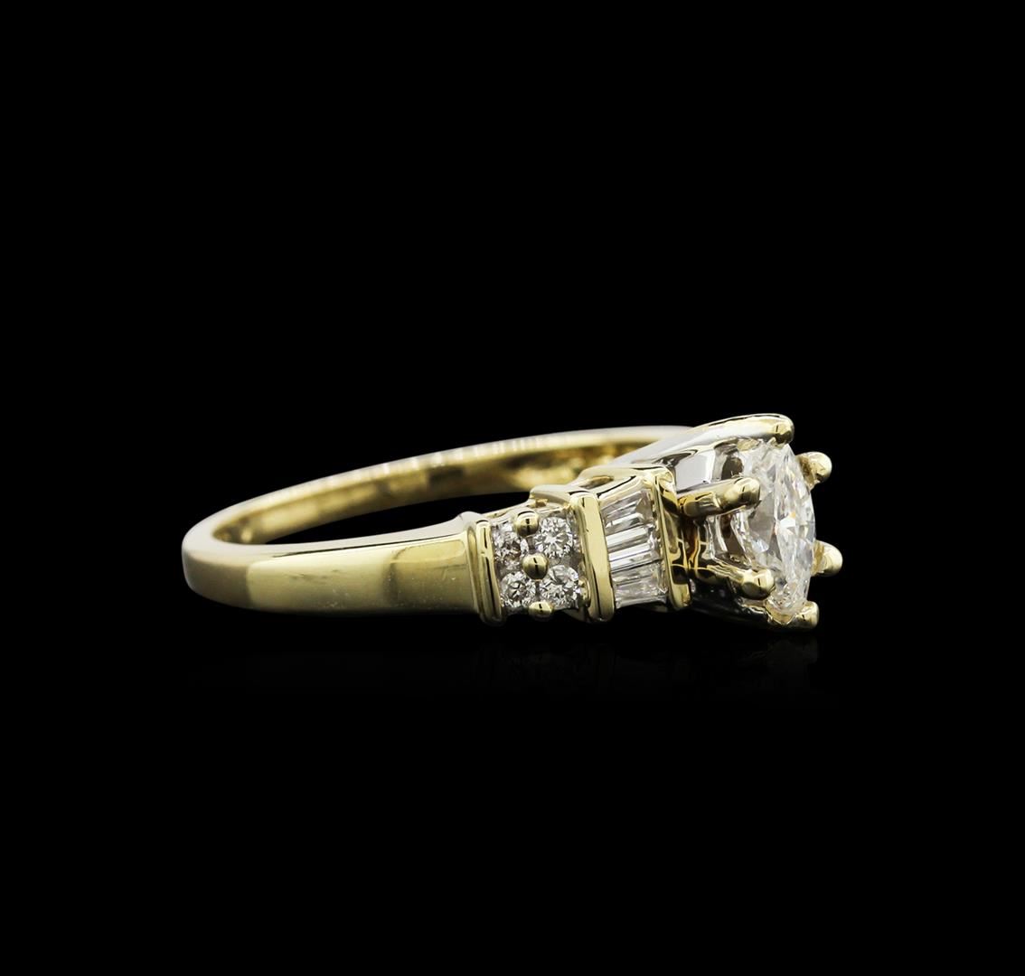 One electronically tested 14KT yellow gold lady's cast wedding ring with a tapered shank with a bright polish finish. The featured lady's ring has a shank measuring 1.80 millimeters in width. Identified with markings of "14K". Condition is new, good workmanship. Containing: One prong set marquise shaped cut diamond, measuring 7.00 x 3.90 x 2.73mm (depth est.) , 5.00.%. GTCF approximate weight of 0.46ct. Graded in the setting. Clarity: SI-2. Color: H - I. Cut Good Six channel set baguette cut diamonds, measuring from 2.00 x 1.45 x 1.23mm (depth est.) to 2.15 x 1.65 x 1.40mm (depth est.) approximate total weight of 6 Stones = 0.24ct. Graded in the setting. Clarity: SI-1 to SI-2. Color: H - I. Cut Good Eight prong set round brilliant cut diamonds, measuring 1.50 - 1.40 x 0.87mm (depth est.) approximate total weight of 8 Stones = 0.09ct. Graded in the setting. Clarity: SI-1 to I-1. Color: H - I. Cut Good. Total Weight of Diamonds 0.79ct. Total Weight of Ring 4.00gm. GAS Appraised at $3,885.00.