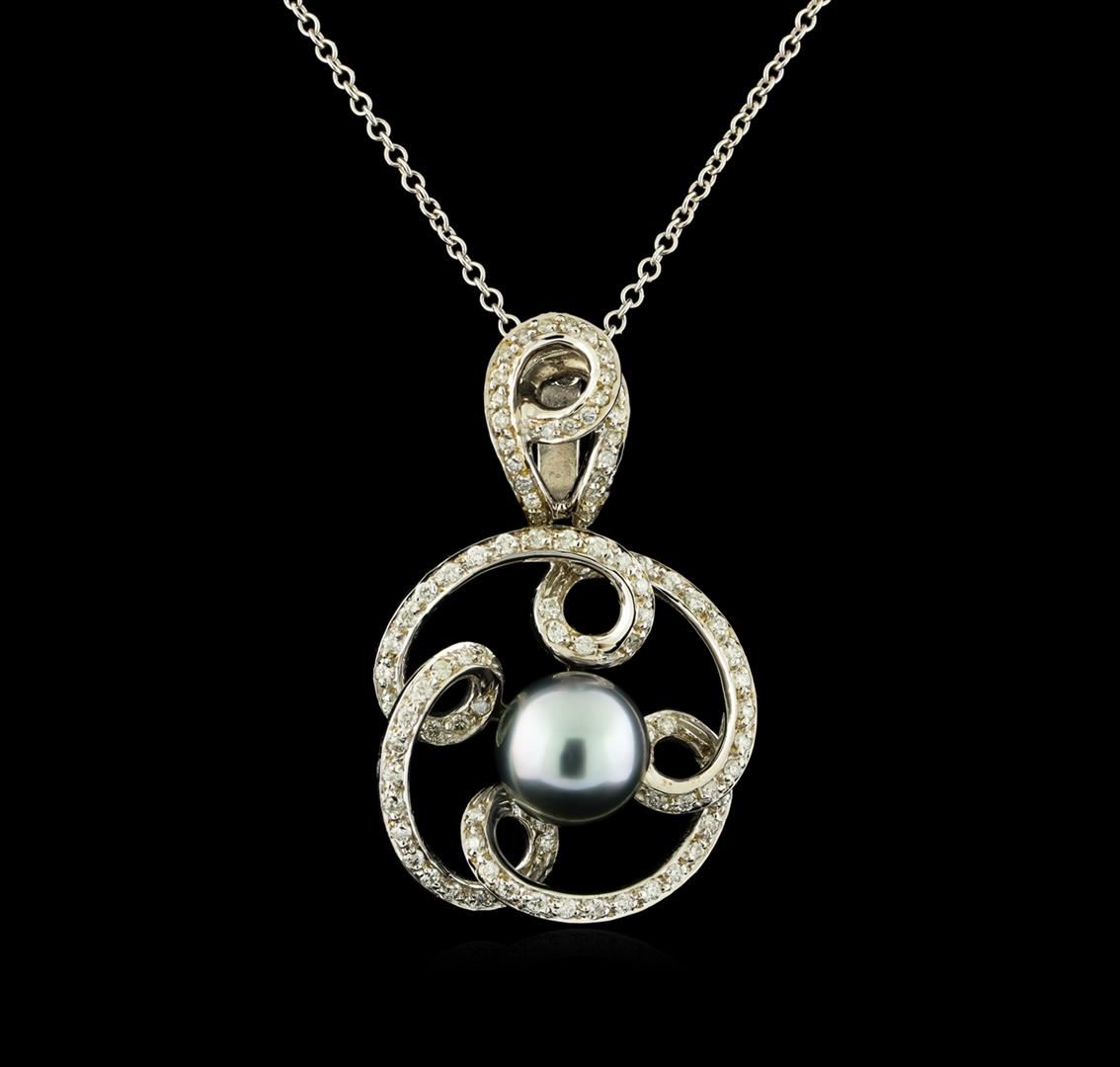 One electronically tested 14KT white gold lady's combination cast & assembled fashion pendant & chain 18.0" long, 1.6mm round cable link with a lobster claw clasp with a bright polish finish. The featured lady's pendant has a circular swirl motif with a total drop of 40 millimeters. Identified with markings of "K14". Condition is new, good workmanship. Containing: One Tahitian pearl, 10.2mm in size to 10.0mm in size. The pearl is silver in color, blue overtone with a good luster, round to near round, and mostly clean. Graded in the setting. Ninety-Three prong set round brilliant cut diamonds, measuring 1.40 - 1.20 x 0.81mm (depth est.) approximate total weight of 93 Stones = 0.79ct. Graded in the setting. Clarity: SI-1 to I-1. Color: H - I. Cut Good. Total Weight of Diamonds 0.79ct. Total Weight of Pendant & Chain 12.30gm. GAS Appraised at $5,385.00.