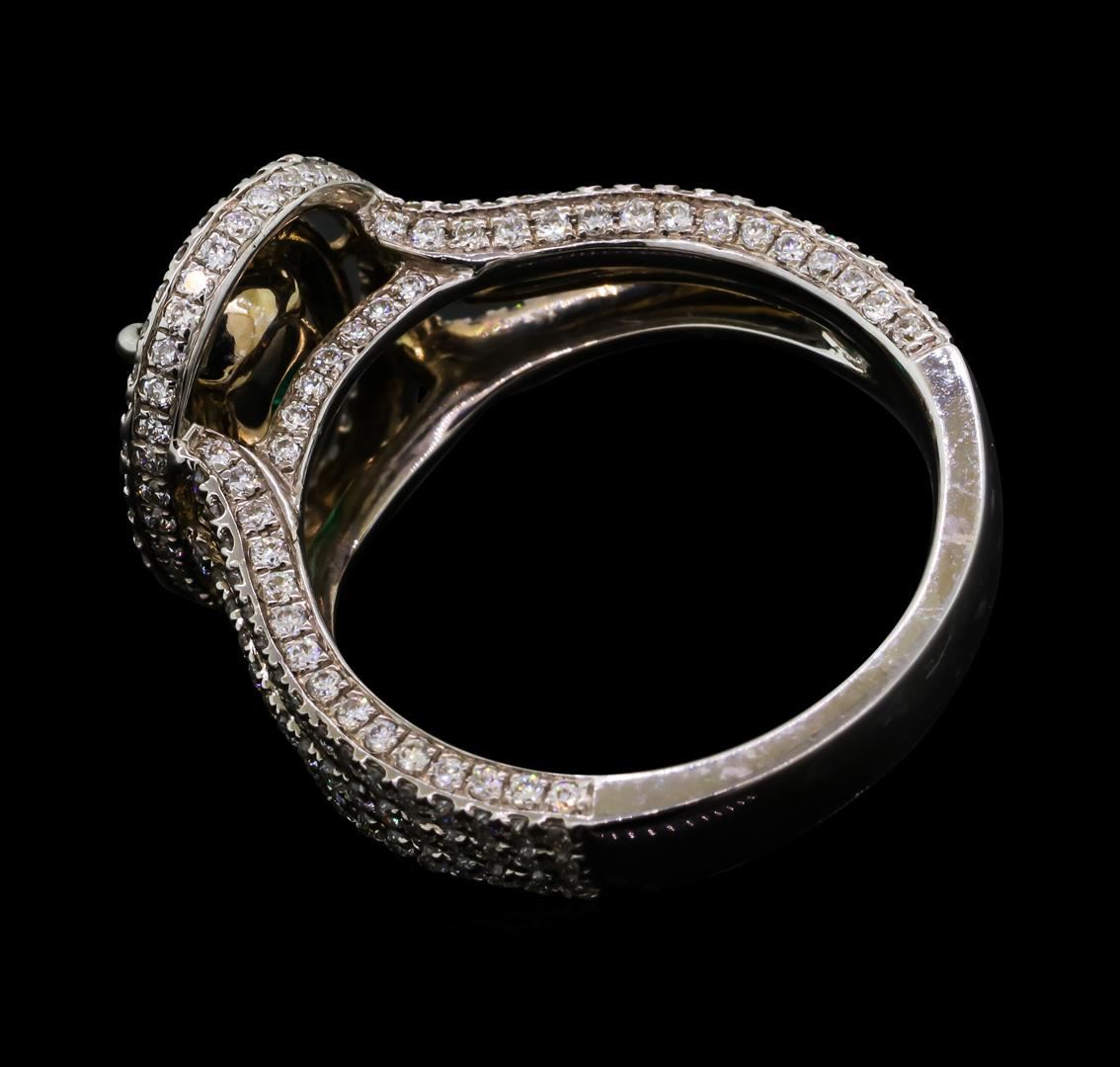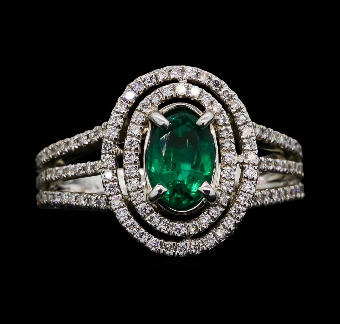 One electronically tested 18KT white gold ladies cast & assembled emerald and diamond ring. The featured emerald is set within tiered concentric diamond bezels supported by three-way split diamond shoulders, completed by a three millimeter wide band. Bright polish finish. Identified with markings of '18K 750'. Condition is good. Containing: One prong set oval mixed cut natural emerald, measuring 7.00 x 5.00 x 3.70mm, approximate weight of 0.79ct., clarity is moderately included, type III, medium dark, moderately strong, very slightly bluish green color, (GIA vslbG 6/4), cut is good. Transmitting light with a minimum of distortion, transparent. Naturally occurring internal & external characteristics are present. Indications of oil residue. Graded in the setting. Two Hundred Seventy-Two prong set round brilliant cut diamonds, measuring 1.00 - 1.00 x 0.60mm (depth est.) approximate total weight of 272 Stones = 1.03ct. Graded in the setting. Clarity VS-2 to SI-1. Color: E - G. Total Weight of Colored Stones 0.79ct.. Total Weight of Diamonds 1.03ct.. Total Weight of Ring 5.85gm. AIG Appraised at $8,970.00.