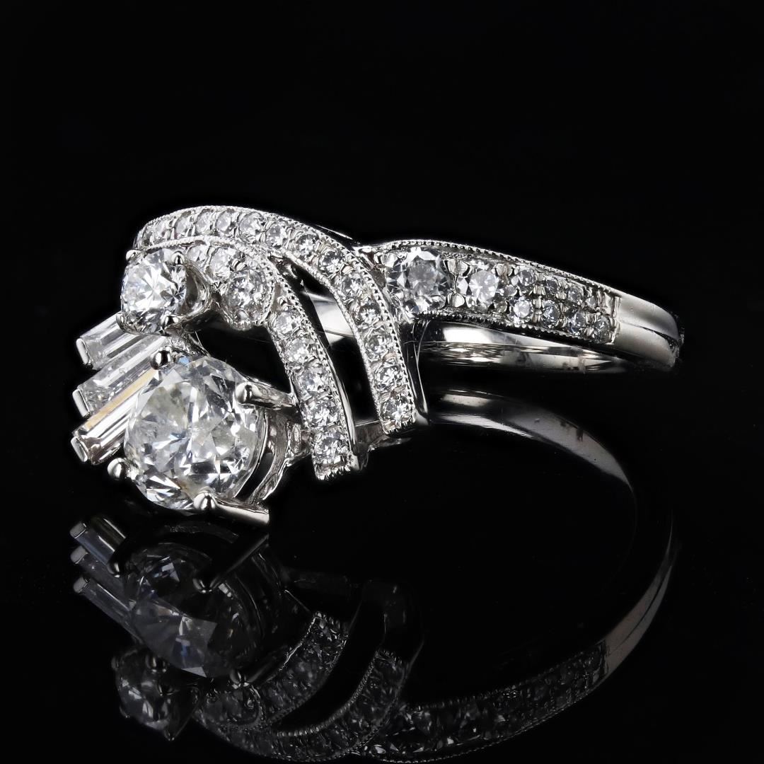 One polished, stamped, and tested platinum ring with a bright finish. The ring is mounted with 1 genuine diamond center stone weighing approximately 0.80 carat, and 43 genuine faceted diamonds weighing approximately 0.70 carats. This item weighs 6.3 grams, condition is new, excellent workmanship. #MAIN GEMSTONE# Identity: Natural Diamond Shape: Round Cutting Style: Brilliant Cut Average Diameter: 5.6mm Weight: 0.80 carat Color Grade: H Clarity Grade: I1 Cut Grade: Very Good Refractive Index: 2.417 Hardness: 10 #ADJACENT GEMSTONES ON RING# Identity: Natural Diamond Shape & Cutting Style: Baguette / Round Brilliant Quantity: 43 Diamonds Measurements: 3.5 - 5.0mm (3 baguette), 1.0 - 3.0mm (40 round) Total Weight: 0.70 carats Color Grade: F - G Clarity Oracle: VS2 - SI2 Refractive Index: 2.418 Hardness: 10 CENTER DIAMOND WEIGHT: 0.80 ct TOTAL DIAMOND WEIGHT: 1.50 cts WEIGHT OF ITEM: 6.3 grams METAL: Platinum #LREF-5882