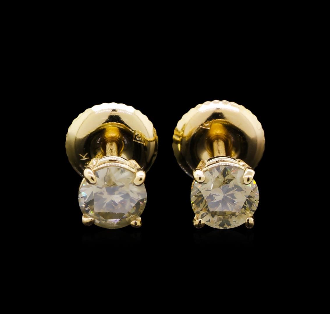 One pair electronically tested 14KT yellow gold cast & assembled diamond solitaire earrings with screw backs. Bright polish finish. Condition is new, good workmanship. Containing: One prong set round brilliant cut diamond, measuring 4.62 - 4.60 x 3.00mm (depth est.) approximate weight of 0.41ct. Graded in the setting. Clarity: I-1. Depth: 65.1%. Table 54.2%. One prong set round brilliant cut diamond, measuring 4.64 - 4.60 x 2.80mm (depth est.) approximate weight of 0.39ct. Graded in the setting. Clarity: I-1. Depth: 60.6%. Table 56.3%. Total Weight of Diamonds 0.80ct. Total Weight of Earrings 1.06gm. AIG Appraised at $1,355.00.