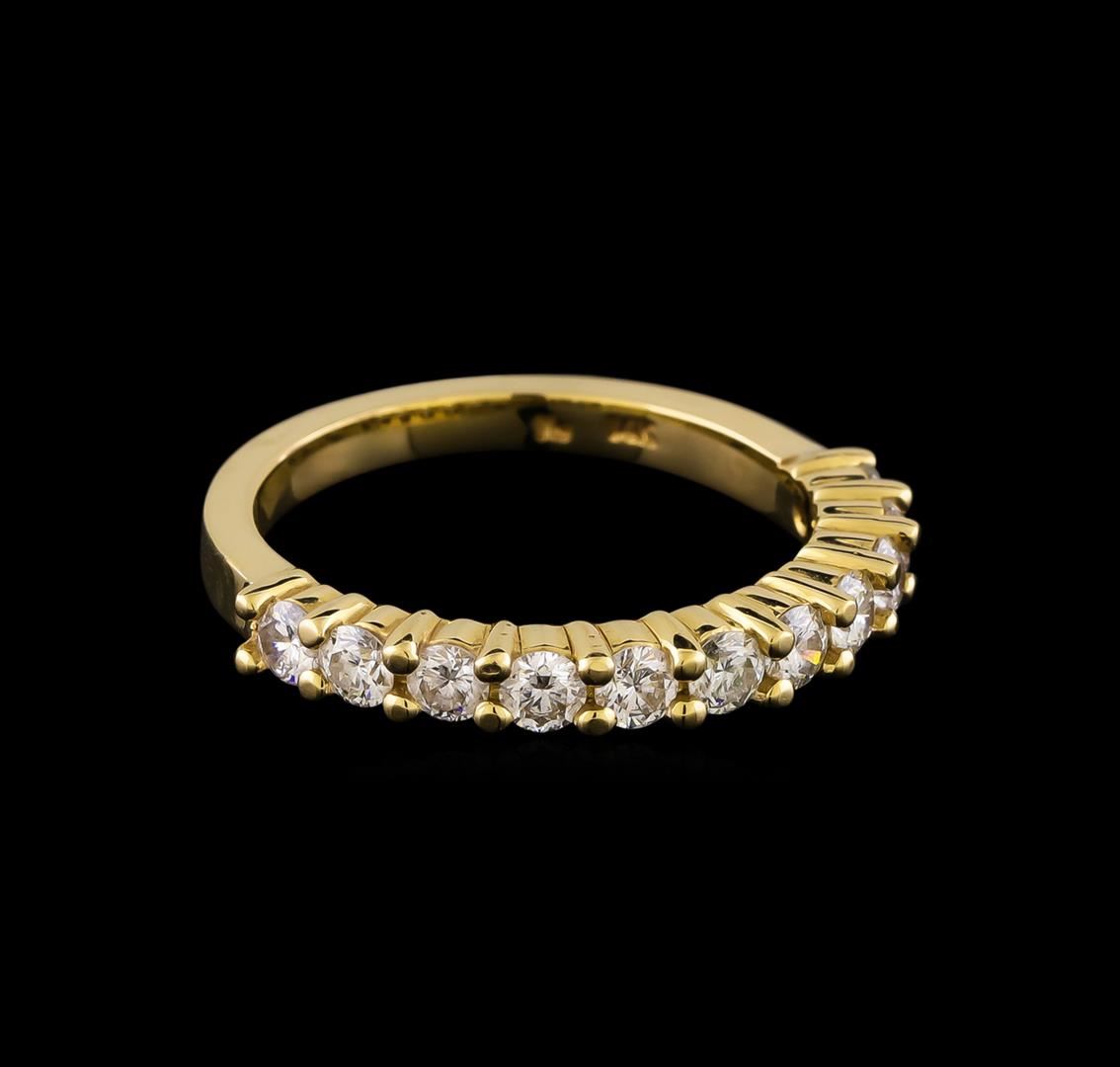 One electronically tested 14KT yellow gold lady's cast wedding ring with a straight line with a bright polish finish. The featured lady's ring has a shank measuring 2.14 millimeters in width. Identified with markings of '14K'. Condition is new, good workmanship. Containing: Eleven prong set round brilliant cut diamonds, measuring 2.70 - 2.65 x 1.66mm (depth est.) approximate total weight of 11 Stones = 0.80ct. Graded in the setting. Clarity VS-1 to VS-2. Color: H - I Cut Very Good. Total Weight of Diamonds 0.80ct.. Total Weight of Ring 3.50gm. GAS Appraised at $2,960.00.