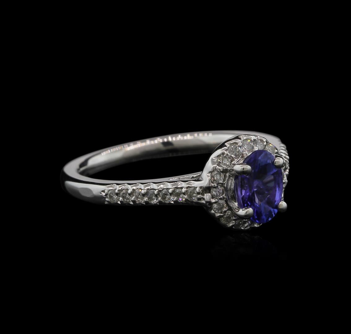 One ring featuring: 14KT white gold weighing 4.10 grams containing one prong set oval shape tanzanite center stone with a total weight of 0.80ct and prong set round diamonds with a total weight of 0.26ct.