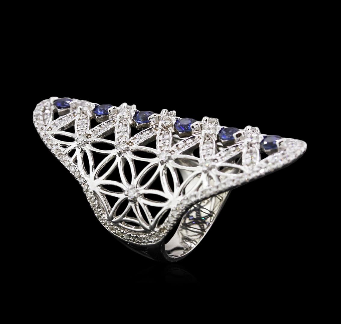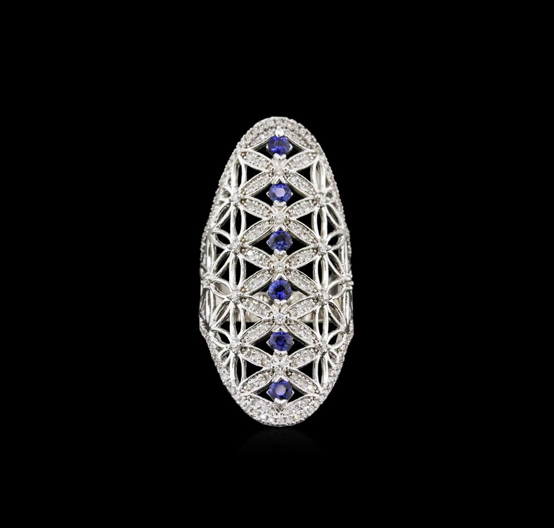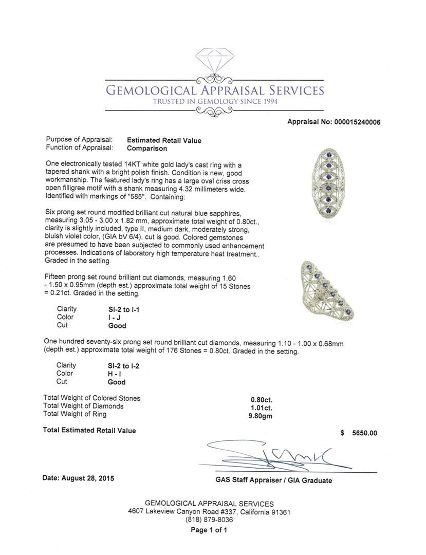 One electronically tested 14KT white gold lady's cast ring with a tapered shank with a bright polish finish. The featured lady's ring has a large oval criss cross open filligree motif with a shank measuring 4.32 millimeters wide. Identified with markings of "585". Condition is new, good workmanship. Containing: Six prong set round modified brilliant cut natural blue sapphires, measuring 3.05 - 3.00 x 1.82 mm, approximate total weight of 0.80ct., clarity is slightly included, type II, medium dark, moderately strong, bluish violet color, (GIA bV 6/4), cut is good. Colored gemstones are presumed to have been subjected to commonly used enhancement processes. Indications of laboratory high temperature heat treatment. Graded in the setting. Fifteen prong set round brilliant cut diamonds, measuring 1.60 - 1.50 x 0.95mm (depth est.) approximate total weight of 15 Stones = 0.21ct. Graded in the setting. Clarity: SI-2 to I-1. Color: I - Good One Hundred Seventy-Six prong set round brilliant cut diamonds, measuring 1.10 - 1.00 x 0.68mm (depth est.) approximate total weight of 176 Stones = 0.80ct. Graded in the setting. Clarity: SI-2 to I-2. Color: H - I. Cut Good. Total Weight of Colored Stones 0.80ct. Total Weight of Diamonds 1.01ct. Total Weight of Ring 9.80gm. GAS Appraised at $5,650.00.