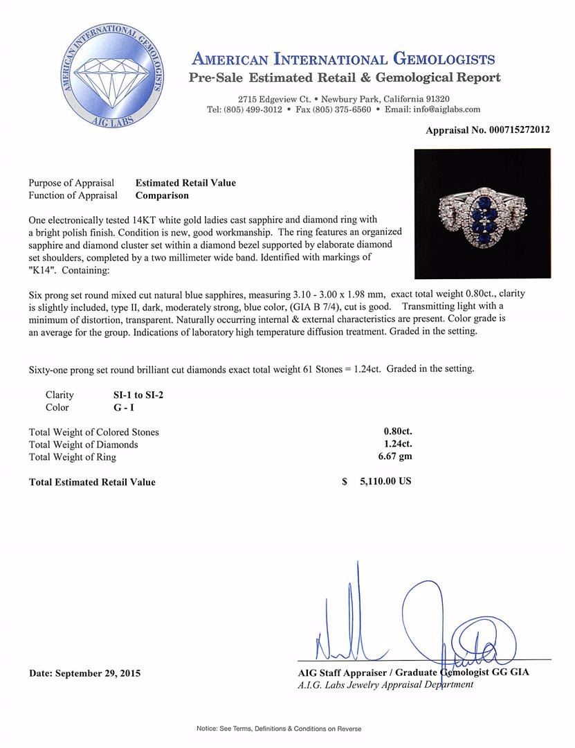 One electronically tested 14KT white gold ladies cast sapphire and diamond ring with a bright polish finish. The ring features an organized sapphire and diamond cluster set within a diamond bezel supported by elaborate diamond set shoulders, completed by a two millimeter wide band. Identified with markings of "K14". Condition is new, good workmanship. Containing: Six prong set round mixed cut natural blue sapphires, measuring 3.10 - 3.00 x 1.98 mm, exact total weight 0.80ct., clarity is slightly included, type II, dark, moderately strong, blue color, (GIA B 7/4), cut is good. Transmitting light with a minimum of distortion, transparent. Naturally occurring internal & external characteristics are present. Color grade is an average for the group. Indications of laboratory high temperature diffusion treatment. Graded in the setting. Sixty-One prong set round brilliant cut diamonds exact total weight 61 Stones = 1.24ct. Graded in the setting. Clarity: SI-1 to SI-2. Color: G - I. Total Weight of Colored Stones 0.80ct. Total Weight of Diamonds 1.24ct. Total Weight of Ring 6.67gm. AIG Appraised at $5,110.00.