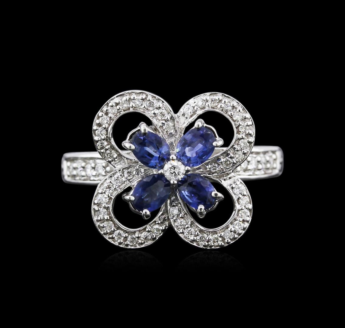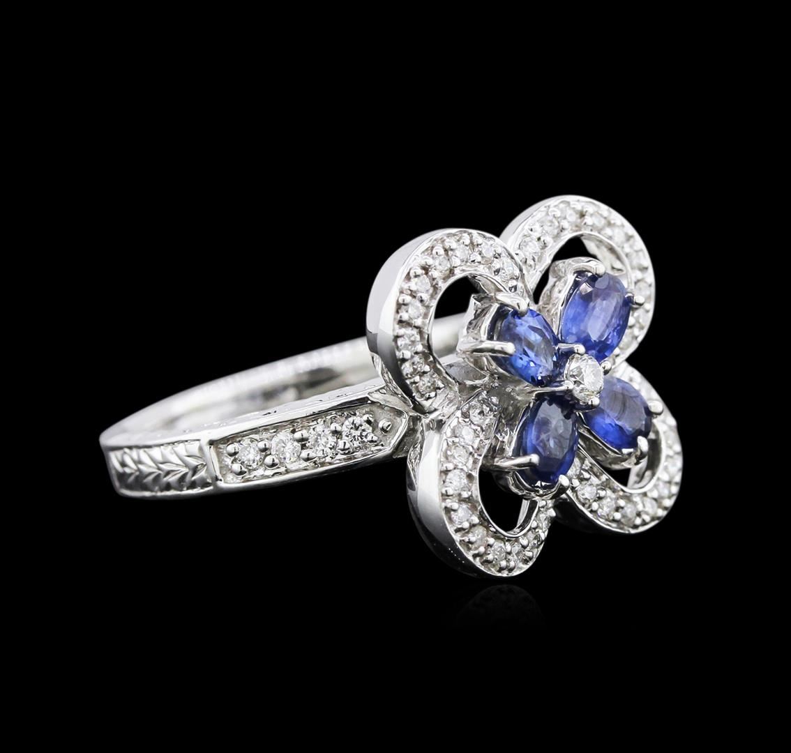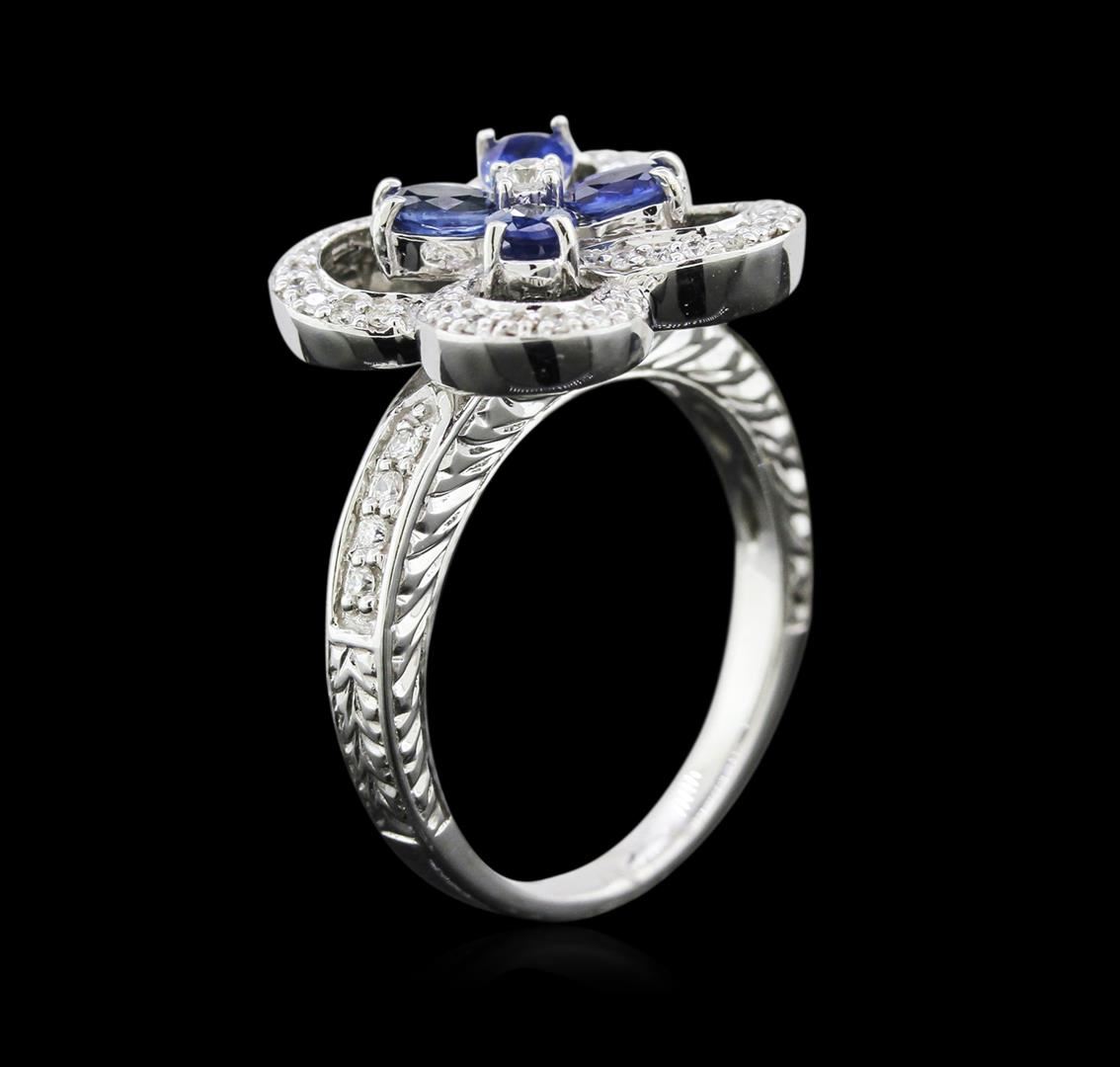 One ring featuring: 14KT white gold weighing 7.20 grams containing prong set oval cut blue sapphires with a total weight of 0.80ct and pave and prong set round diamonds with a total weight of 0.31ct.