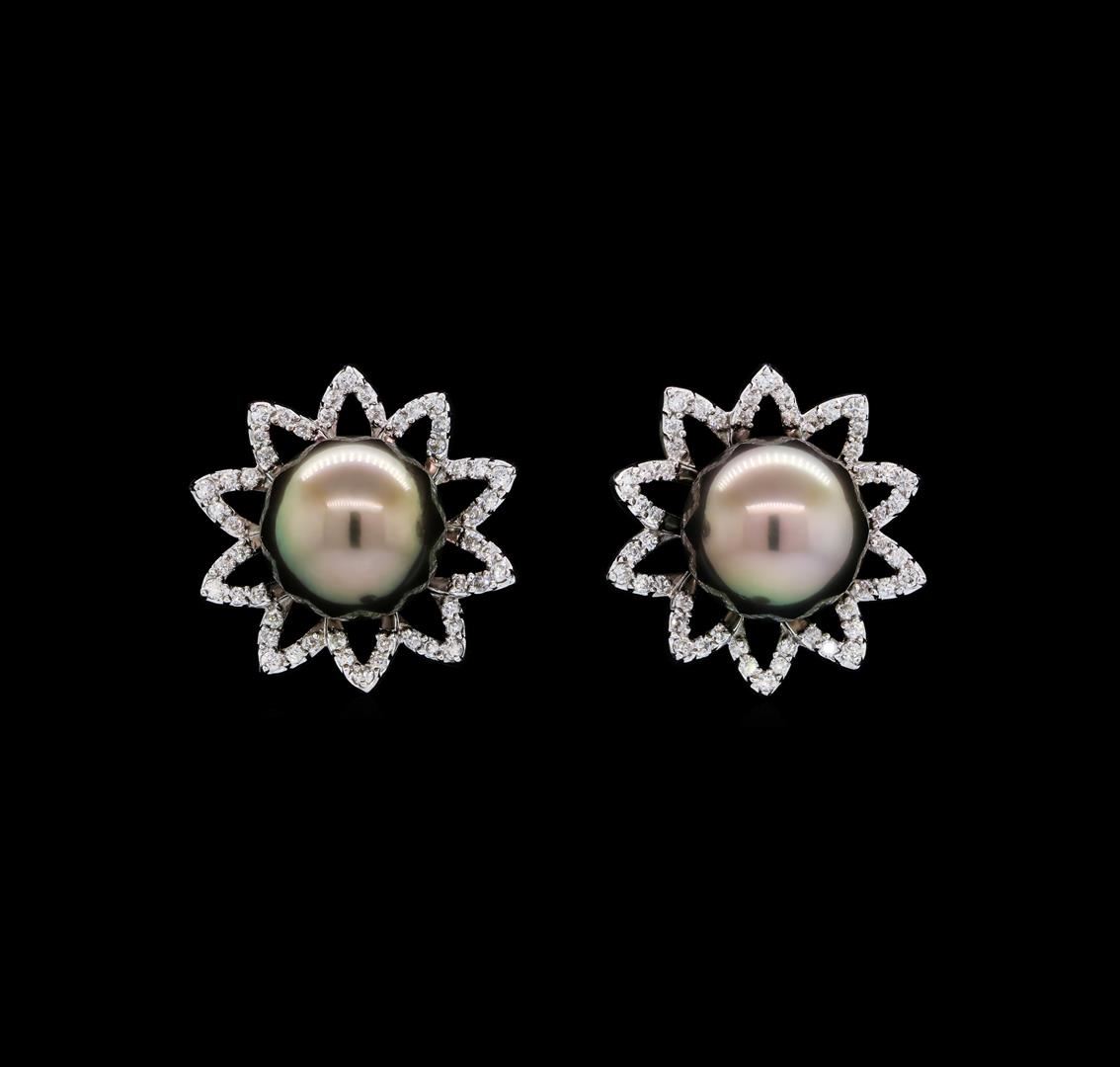 One pair electronically tested 18KT white gold ladies cast & assembled tahitian cultured pearl & diamond earrings with standard backs. Each earring features a tahitian cultured pearl set within a diamond petal flower. Bright polish finish. Identified with markings of '18K'. Condition is good. Containing: Two tahitian cultured pearls, 12.0mm in size to 12.0mm in size. The pearls are black in color with a very good luster, round, mostly clean Graded in the setting.Tahitian cultured pearls form in the large 'Black Lipped' Pinctada Margaritifera oyster, which is about twice the size of the Japanese Akoya oyster. This warm water species from across the central and South Pacific Ocean is at home in the bays and lagoons of the islands & atolls of French Polynesia. Tahitian cultured pearl farmers generally raise their oysters in lagoons.Tahitian cultured pearls take from two to four years to form. Black pearls are known for their iridescent, vibrant, almost metallic natural colors, unique among saltwater cultured pearls. Though commonly called 'Tahitian' pearls, they are actually gray, to a lighter or darker degree. Tahitian pearls have the unique ability to display a variety of colors at the same time, which can be seen glistening on their surface. One Hundred prong set round brilliant cut diamonds, measuring 1.30 - 1.20 x 0.75mm (depth est.) approximate total weight of 100 Stones = 0.81ct. Graded in the setting. Clarity SI-1 to I-1. Color: E - G. Total Weight of Diamonds 0.81ct.. Total Weight of Earrings 13.77gm. AIG Appraised at $7,590.00.