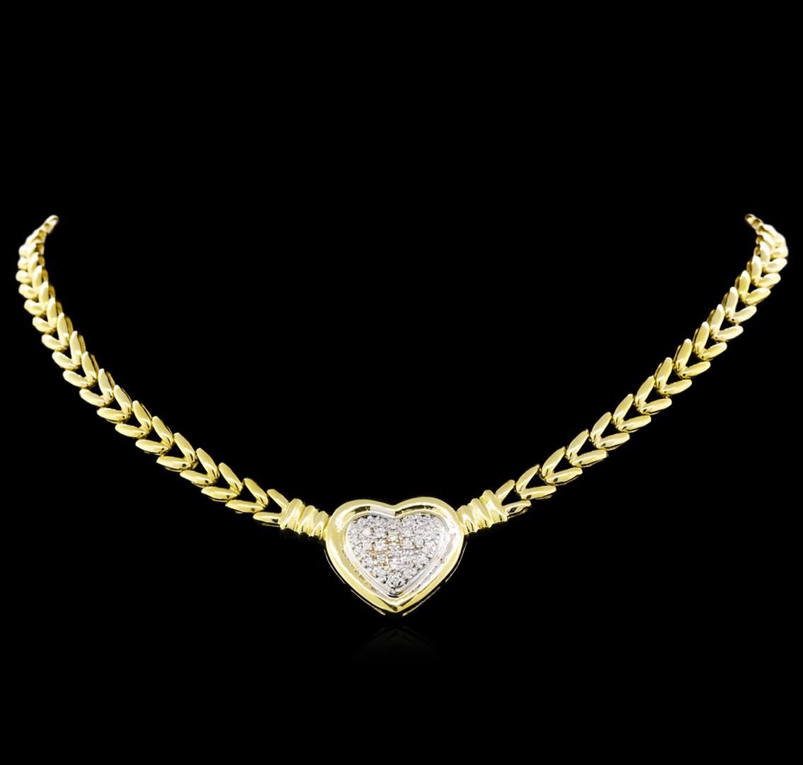 One electronically tested 14KT yellow and white gold lady's combination cast & assembled fashion heart shaped necklace with a tongue clasp & foldover safety with a bright polish finish. The featured lady's necklace has a heart shaped motif and a chain measuring approximately 16 inches in length. Identified with markings of "14K". Condition is new, good workmanship. Containing: Twenty-Nine prong set round brilliant cut diamonds, measuring 2.00 - 1.90 x 1.21mm (depth est.) approximate total weight of 29 Stones = 0.81ct. Graded in the setting. Clarity: VS-2 to SI-1. Color: H - I. Cut Very Good. Total Weight of Diamonds 0.81ct. Total Weight of Heart Shaped Necklace 31.60gm. GAS Appraised at $7,480.00.