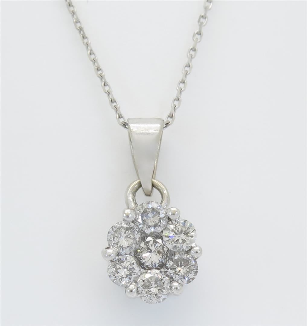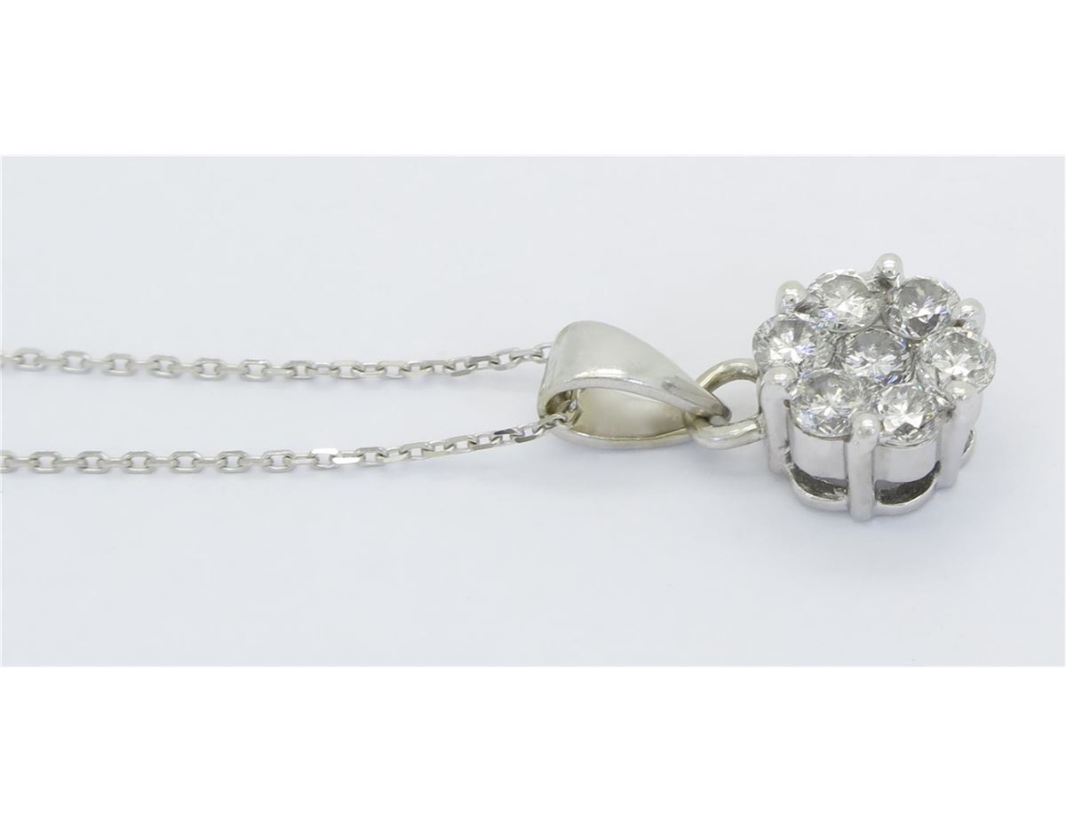 One tested 14K white gold diamond ring. Containing: 7 Round Brilliant Cut Diamonds. Clarity: I. Color: F-G. Approximate total diamond weight: .81CTW. Diamonds are graded in the mounting, unless otherwise stated. Weight: 2.3 grams. Size of chain: 18" long