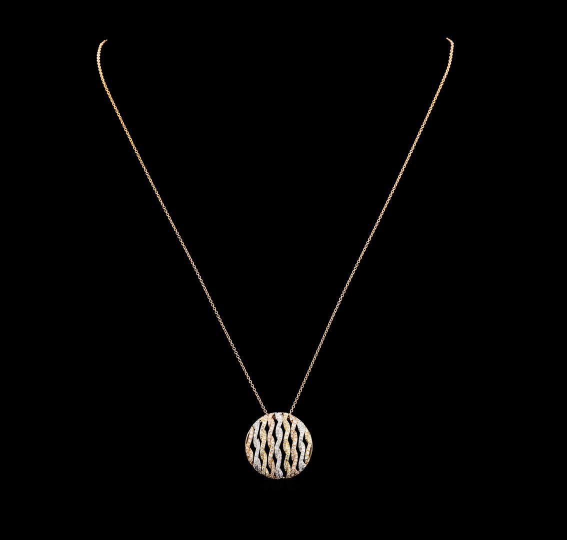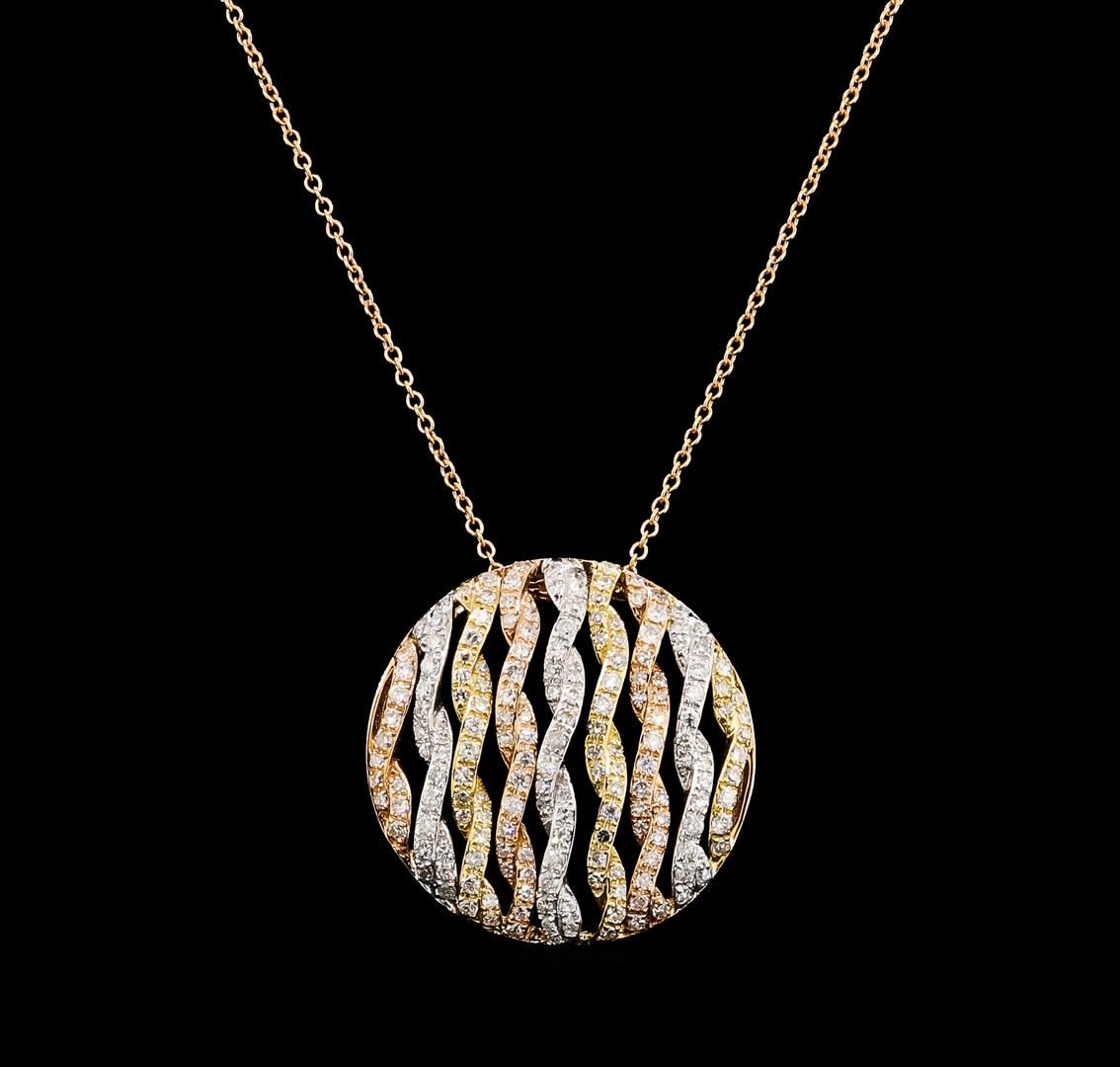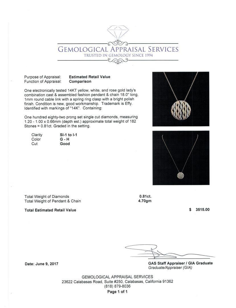 One electronically tested 14KT yellow, white, and rose gold lady's combination cast & assembled fashion pendant & chain 18.0' long, 1mm round cable link with a spring ring clasp with a bright polish finish. Trademark is Effy. Identified with markings of '14K'. Condition is new, good workmanship. Containing: One Hundred Eighty-Two prong set single cut diamonds, measuring 1.20 - 1.00 x 0.66mm (depth est.) approximate total weight of 182 Stones = 0.81ct. Graded in the setting. Color G - H Clarity SI-1 to I-1 Cut Good. Total Weight of Diamonds 0.81ct.. Total Weight of Pendant & Chain 4.70gm GAS Appraised at $3515.00. GAS Appraised at $3,515.00.