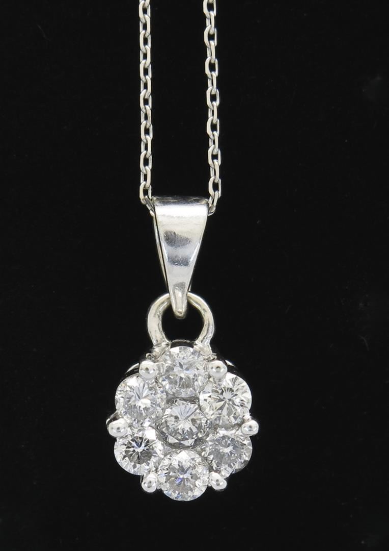 One tested 14K white gold diamond ring. Containing: 7 Round Brilliant Cut Diamonds. Clarity: I. Color: F-G. Approximate total diamond weight: .81CTW. Diamonds are graded in the mounting, unless otherwise stated. Weight: 2.3 grams. Size of chain: 18" long