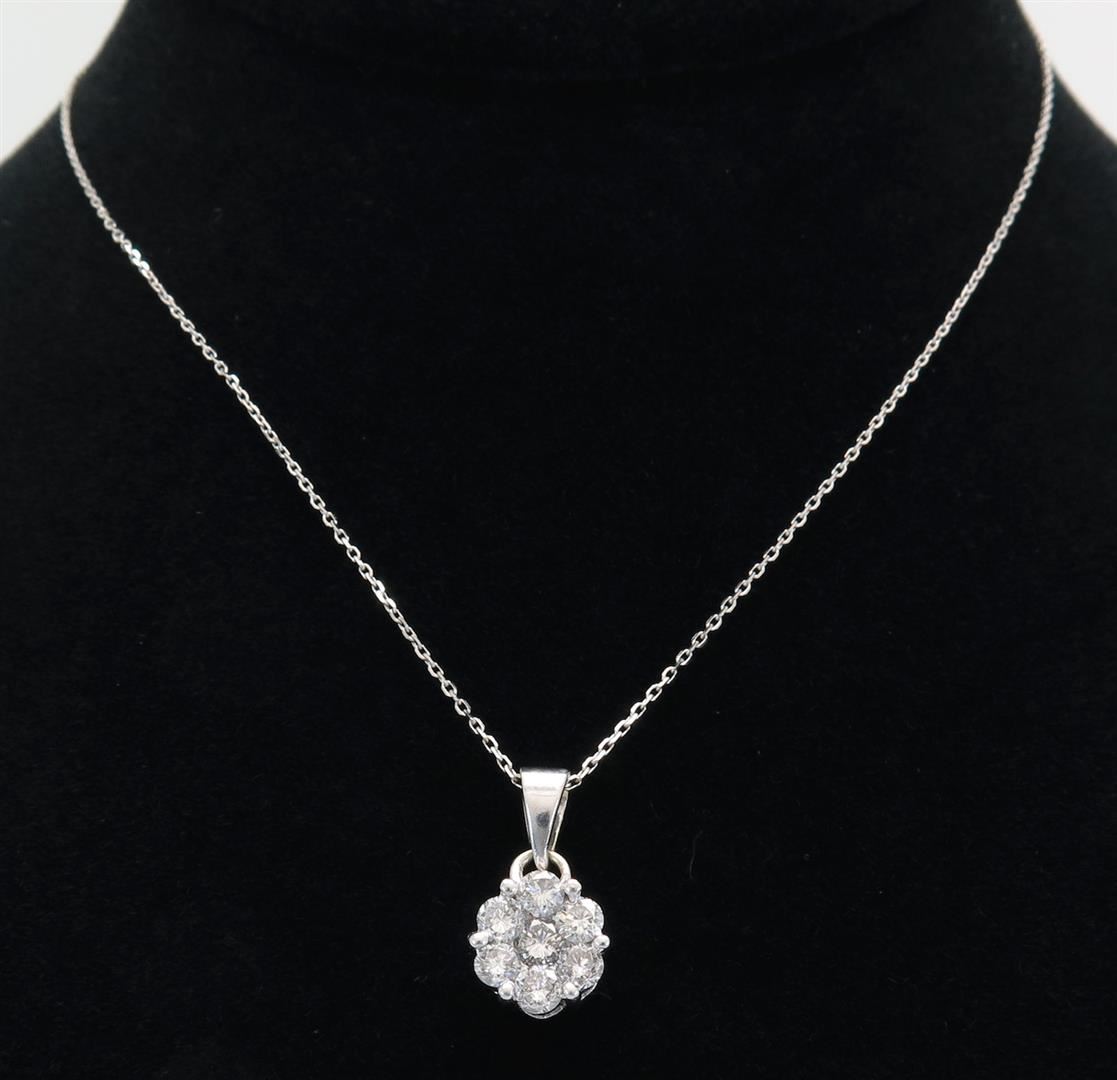 One tested 14K white gold diamond ring. Containing: 7 Round Brilliant Cut Diamonds. Clarity: I. Color: F-G. Approximate total diamond weight: .81CTW. Diamonds are graded in the mounting, unless otherwise stated. Weight: 2.3 grams. Size of chain: 18" long