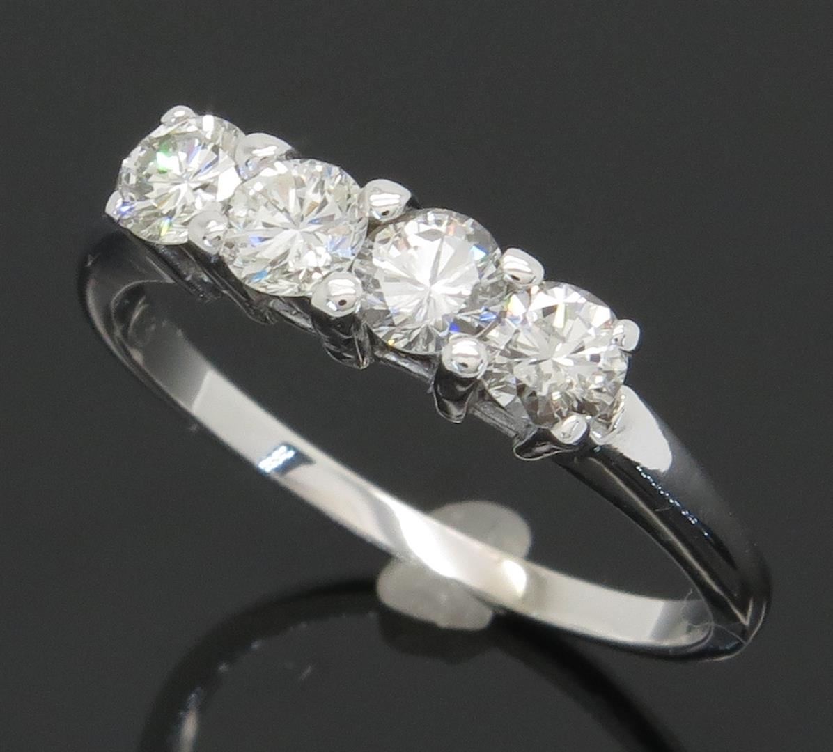 One tested 14K white gold diamond ring. Containing: Four Round Brilliant Cut Diamonds. Clarity: SI, Color: G-I. Approximate total diamond weight: .81CTW. Diamonds are graded in the mounting, unless otherwise stated. Weight: 2.7 grams, Size: 7.0.